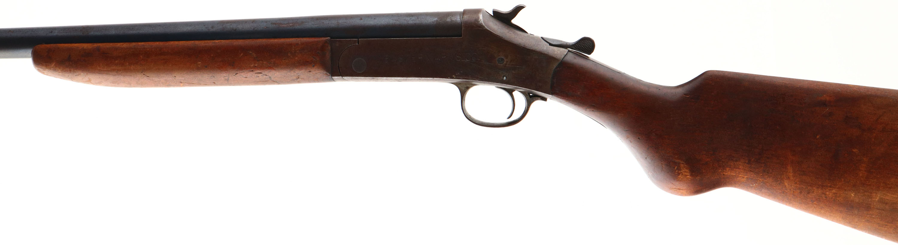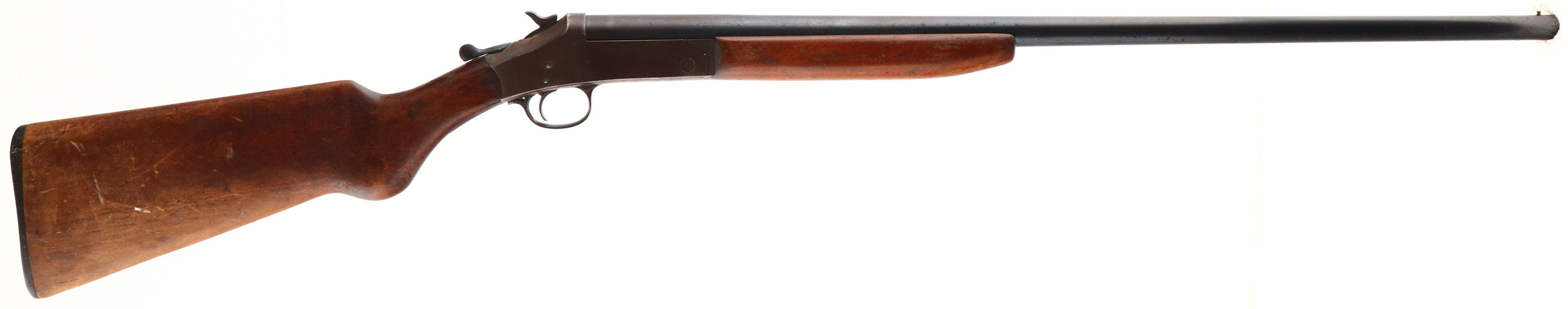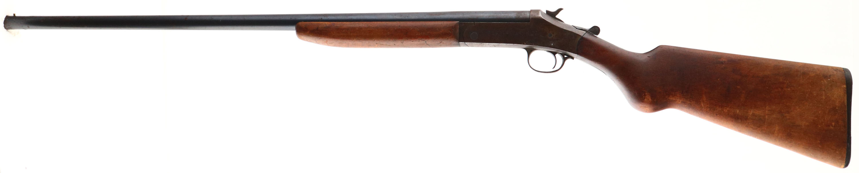 Eastern Arms Co. Model 105.9, CAL: 20GA, MFG: 1943-56, SN: A652630, Break Action Single Shot, Choke: IC, 28'' barrel. The round knob wood stocks are good. There is a grain crack on the top of the wrist, along with numerous nicks, dings, scratches & thinning/flaking finish. The metal blue finish on the barrel rates 50%, with spotting & areas fully toned to a brown patina. The case-hardened receiver shows remnants of case-colors under the brown patina. Bore is good & bright, with visible wear & some roughness. Single front bead. Grooved plastic buttplate. FFL or C&R Req. - Value: 80 to 160