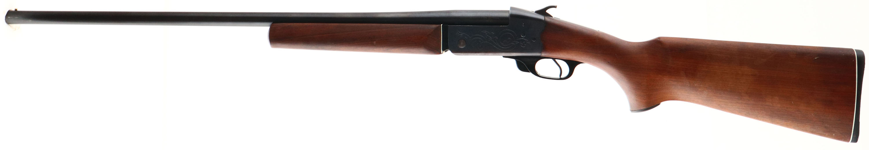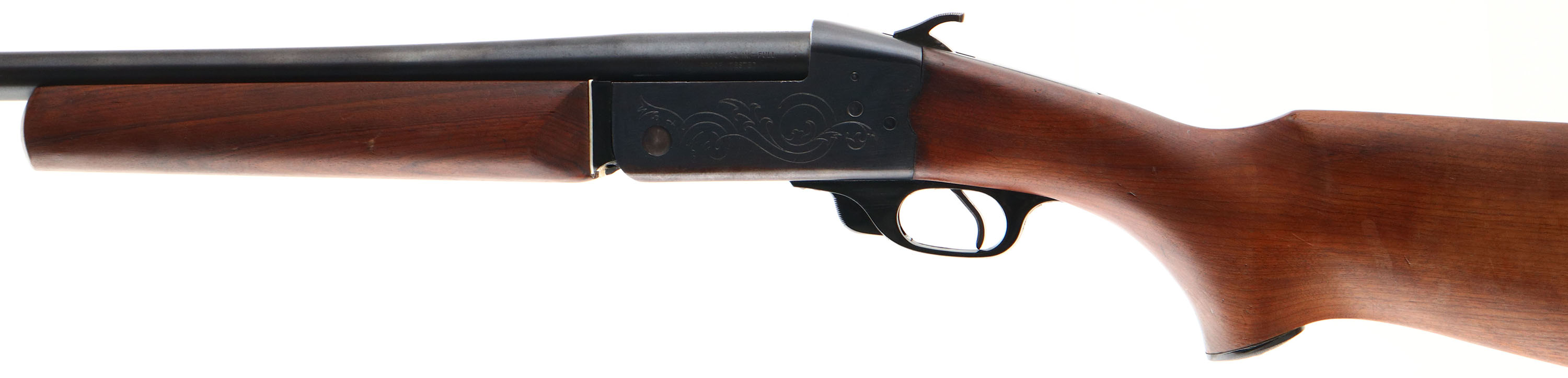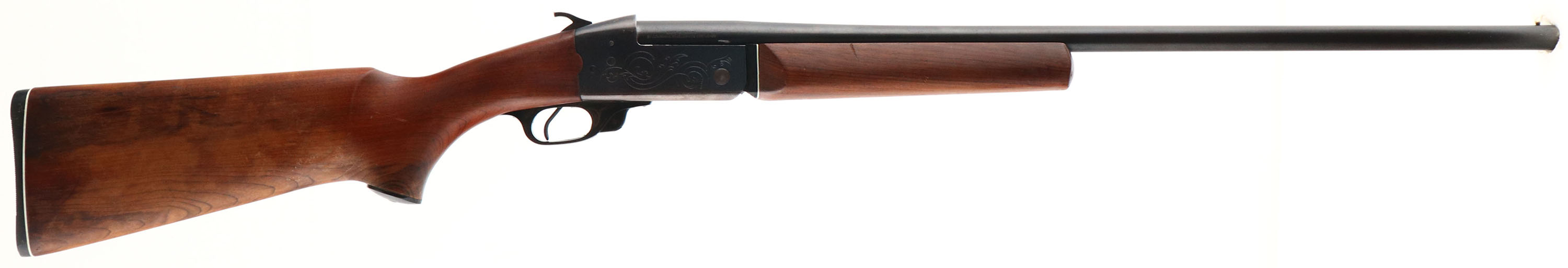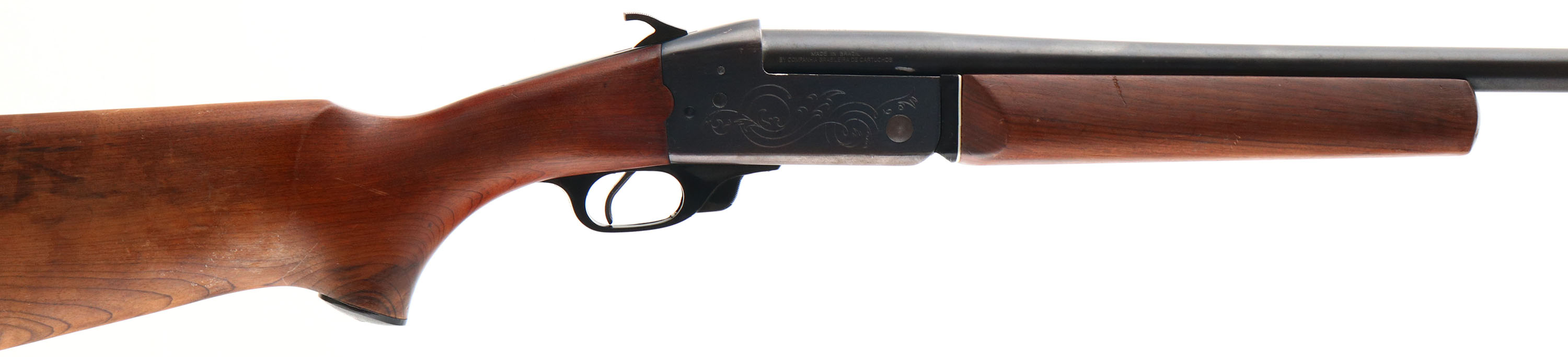 K-Mart (Brazil Mfg.), Model 151, CAL: 20 GA, MFG: 1970's-80's, SN: 835541, Break Action Single Shot, Choke: Full, 27 7/8'' barrel. The capped pistol grip wood stocks are very good, having been lightly sanded & refinished. There are smoothed contusions, dings, scrapes & areas of spotty/thinning finish. The black forend cap is broken, with the bottom portion missing. The metal blue finish rates 90% coverage on the barrel & 70% coverage on the receiver, toned to a brown patina, with other areas worn to metal gray & toned to a brown patina. Bore is excellent, with a few visible striations. Single front bead sight. Grooved plastic buttplate. FFL Req. - Value: 100 to 200