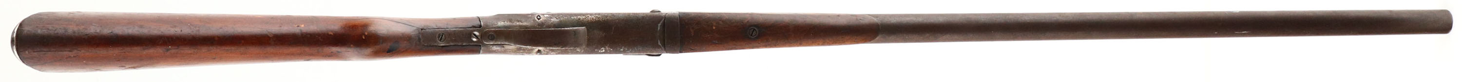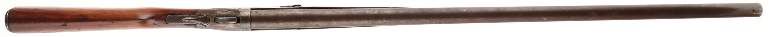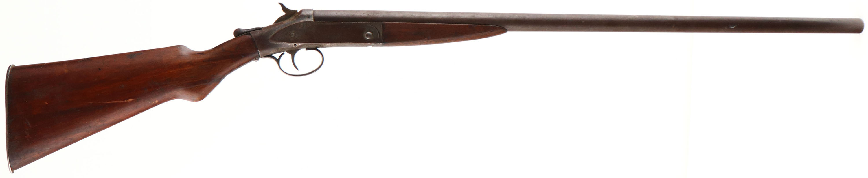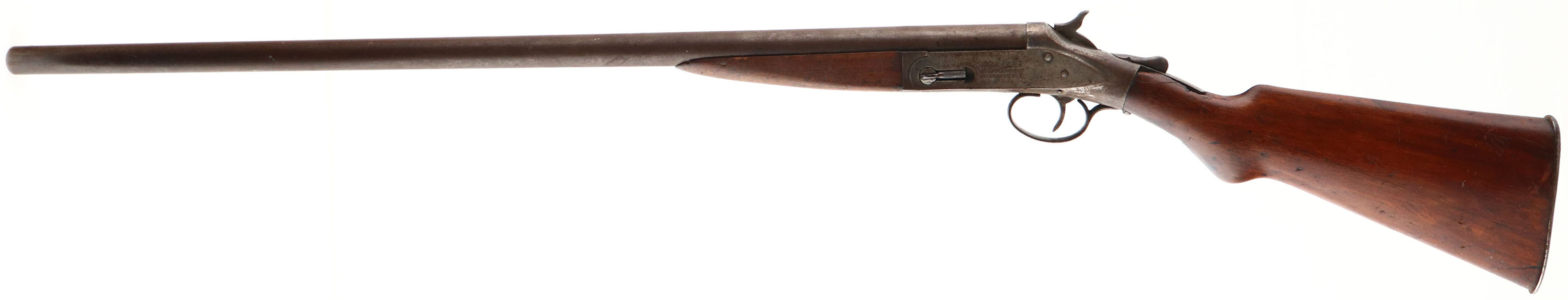 Hopkins & Allen, Single Break, CAL: 12GA, MFG: N/A, SN: V9377, Break Action Shotgun, 30'' barrel. The round knob wood stocks are fair. There are multiple cracks in the buttstock, edge chips around the upper tang, with scrapes & dings throughout. The metal blue finish has fully toned to a brown patina & the case-hardened receiver has remnants of case-colors in protected areas, but mostly worn to metal gray & toned to a brown patina. Bore is fair, dark & rough. Ground down front bead. Checkered metal buttplate. FFL or C&R Req. - Value: 40 to 100