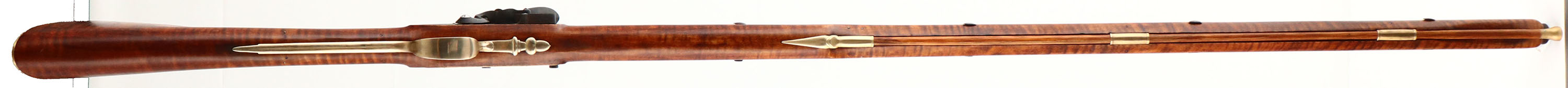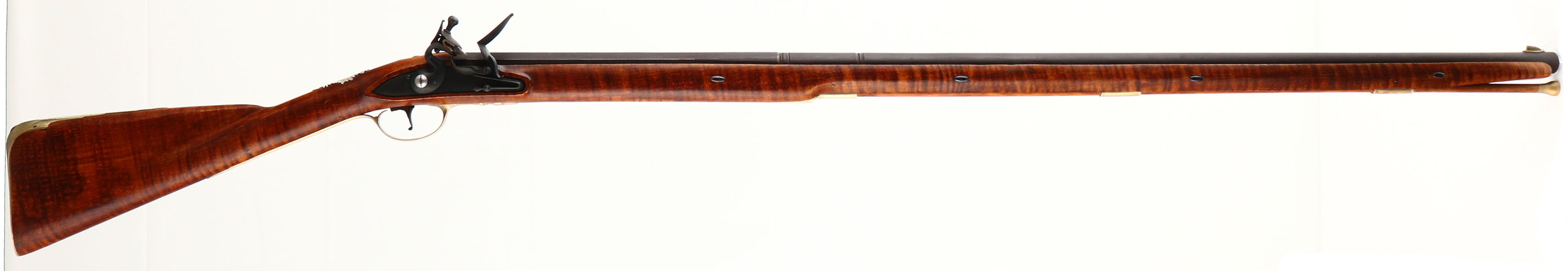 G.B. White, Buck & Ball Kit gun, Cal: .60, MFG: 1950's-80's, S/N: None, Flintlock Smoothbore muzzleloader, 42'' 1/4 octagon barrel. The straight wrist, striped pattern wood stock is excellent with little to no visible wear. Stock has a silver decorative emblem inlaid into the top of the wrist. The barrel is a browned finish with some thinned areas. The lock plate & other lock parts have been blued. The top of the barrel is marked ''G.B. WHITE''. All brass components are bright & shiny. The bore is excellent. Its bright & mirror like the barrel holds a bead front sight. The stock carries a brass buttplate with a extended tang over the comb that has hand engravings of a cannon & drum scene. Rifles comes with ramrod, a leather lock cover that marked ''The Leatherman'', & a piece of flint inside the hammer. A stunning example of a musket. Muzzleloader No FFL Req. - Value: 600 to 1000