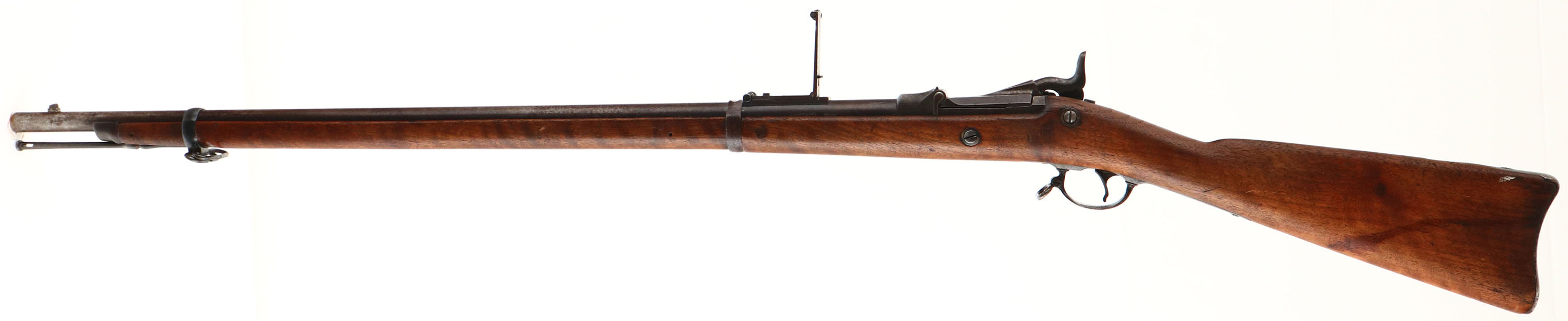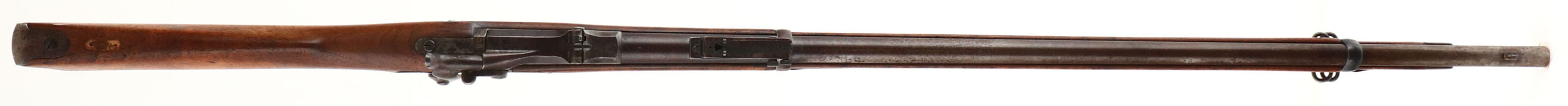 CONDITION: The straight wrist black walnut stock is very good as being lightly sanded & oiled. The stock also has various small nicks, dings, dents, scratches, & wear from use/age. There are a few cracks around the rear lock plate screw, on the left side of the stock. All that remains of the circle ''P'' proof on the bottom of the wrist is the faint remains of the circle. There is no visible inspectors cartouche on the stock. The heal of the stock has a cutout & screw holes for a tag. The metal has mostly toned to a chocolate brown patina with gun metal gray showing in areas & spotting of darker brown patina. The lock plate has worn to a gun metal gray with spotty patina. The left side of the barrel is stamped with a ''V'' over ''P'' over a eagles head, ''P'', ''I''. The top of the breech block is stamped ''U.S.'', ''MODEL'', ''1884''. The rear of the Receiver is marked with the S/N. The lock plate is marked with a American eagle, ''U.S.'', ''SPRINGFIELD'', the markings are starting to wear down & fade. Both barrel bands are marked ''U''.. The bore is very good. Its bright with strong rifling, but has a few spots of light roughness/pitting. The barrel holds a blade front sight with a Buffington rear sight. The stock carried a steel trapdoor buttplate that's worn gray & has roughness, nothing inside the trapdoor. The upper tang of the buttplate is marked ''US''. The stock carries both sling swivels with the stacking loop. Rifle has its cleaning rod. Antique No FFL Req.