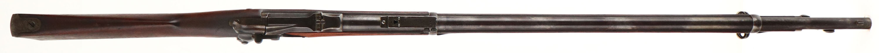 CONDITION: The straight wrist black walnut stock is good as being lightly sanded & re-finished. The stock also has various nicks, dings, gouges, scratches & wear from use/age. There are a few cracks around the wrist & lock plate, two emanate from the upper tang one goes down the wrist to the comb & the other wraps around to the lock plate, there are two more cracks/ gouges in the wood between the lock plate & trigger guard. There is also a large chunk of wood missing on the right side, right Infront of the lock plate, the edge has been sanded & smoothed & finished over. The left side of the stock above the trigger is marked with the Inspector cartouche ''SWP 1890''. The bottom of the wrist is marked with a faint circle ''P'' firing proof. The heal of the stock is stamped with a Faint ''20''. The metal has mostly toned to a brown patina with consistent roughness & spots of gun metal gray. There are spots of tool ding marks down the barrel & some metal components. The lock plate has been blued & has spots of thinning & punch marks. The left side of the barrel is stamped with a ''V'' over ''P'' over a eagles head, ''P'', ''I''. The top of the breech block is stamped ''U.S.'', ''MODEL'', ''1884'', the marking is thinned & partially gone. The rear of the Receiver is marked with the S/N. The lock plate is marked with a American eagle, ''U.S.'', ''SPRINGFIELD''. Both barrel bands are marked ''U''. The bore is good. Its bright with consistent roughness & spots of light pitting. The barrel holds a blade front sight with a Buffington rear sight. The stock carried a steel trapdoor buttplate that's worn gray & has roughness, nothing inside the trapdoor. The stock carries both sling swivels with the stacking loop. Rifle has its Rod Bayonet/ cleaning rod. Antique No FFL Req.