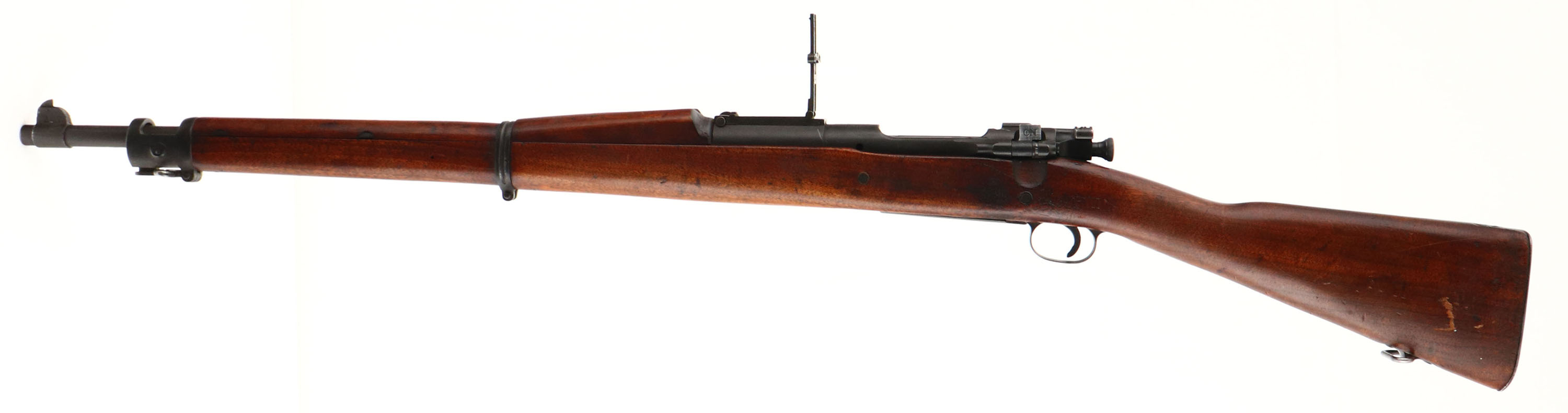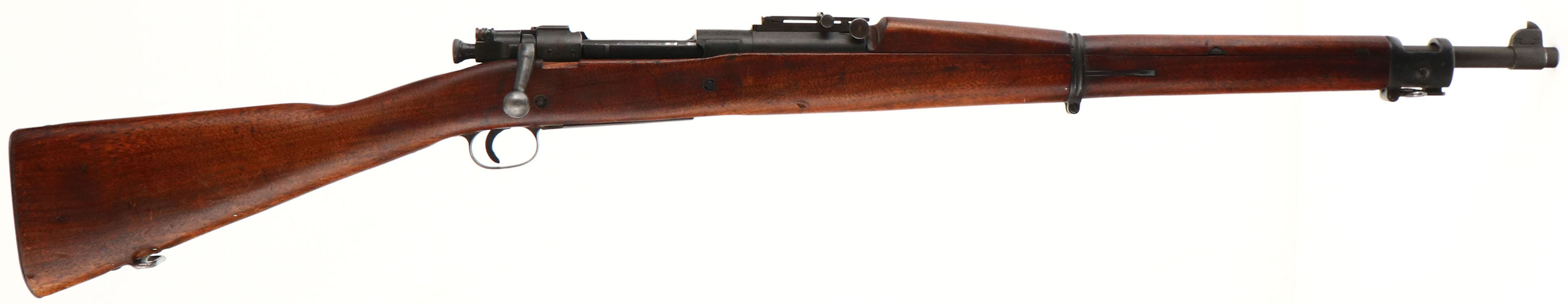 CONDITION: The straight wrist walnut stock is very good with light nicks, dings, scratches, & wear from use/age. There is a small part of the stock that has been notched out on the right side, at the rear receiver bridge that was done to mount a new rear sight. The left side of the stock above the trigger is marked with a very faint ''AA'', & a less faint ''AAHO'' in a box. The bottom of the wrist is stamped with a ''P'' firing proof. The bottom of the stock Infront of the magazine is stamped with a ''C''. The dark parkerized finish rates 85% overall with areas of wear & thinning. The top of the receiver is marked ''U.S.'', ''REMINGTON'', ''MODEL1903'', & the S/N. the top end of the barrel is marked ''R A'', flaming bomb, ''4-42''. The right side of the rear receiver bridge has two small holes that were drilled & tapped for a rear sight, screws still inside the holes. All small parts including the bolt are marked ''R'' meaning they are Remington made. The bore is Excellent. Its bright & mirror like with strong rifling, bore is the 4 groove rifling. The barrel holds a blade front sight with a Buffington rear sight. The stock carries a parkerized steel trapdoor buttplate, nothing inside trapdoor. Rifle has the rear sling swivel & the stacking swivel but is missing the front sling swivel. FFL or C&R Req.