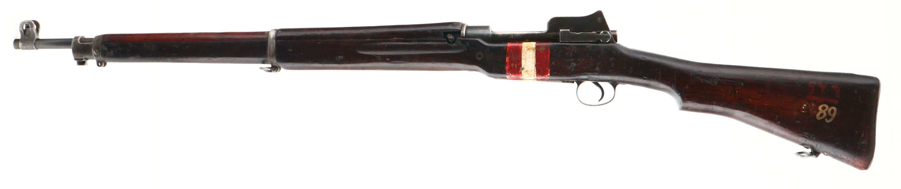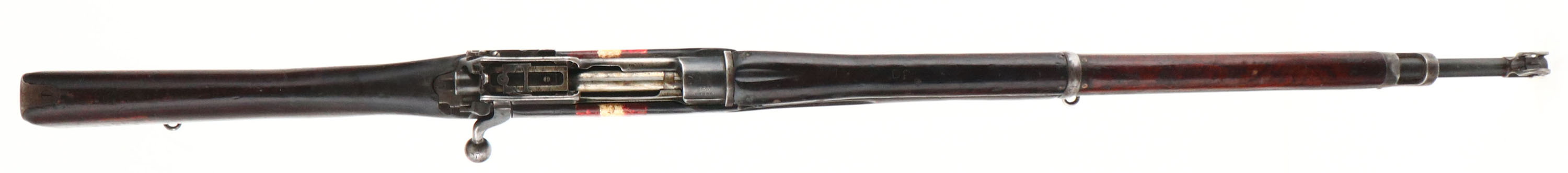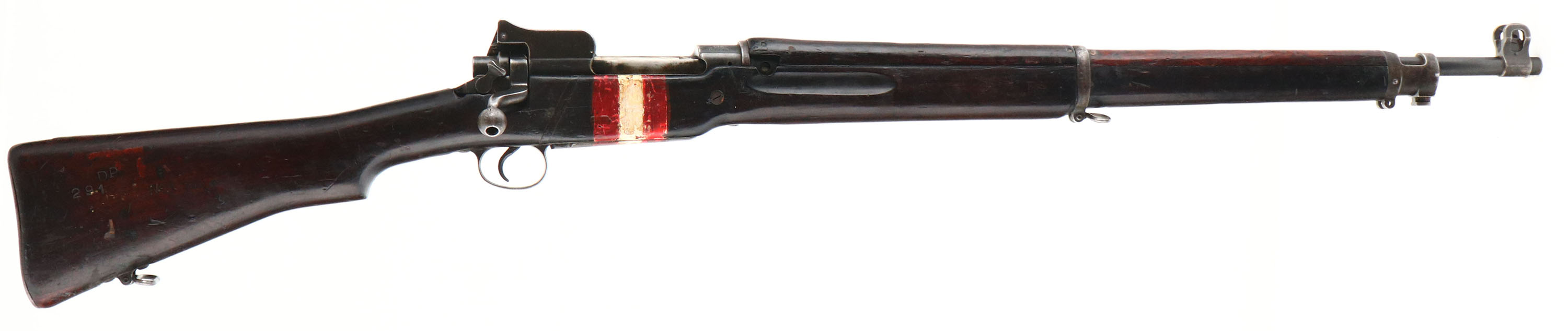 Eddystone, Model: P14 drill purpose rifle, Cal: .303 British, MFG: 1916, S/N: 64890, Bolt action rifle, 26'' barrel. The semi-pistol grip wood stock is very good with nicks, dings, scratches & wear from use/age. The stock has darkened from oils & age. The stock has been painted around the magazine to indicate this a drill rifle only & not meant to be fired. Both cheeks of the stock have paint markings & faded cartouches. The metal finish rates 70% with areas of wear/thinning & areas starting to tone brown. The top of the receiver is marked with British proofs, a faint ''DP'' stamp, ''ERA'', & the S/N. the bore rating is irrelevant since a steel rod has been inserted to the chamber & welded in place ruining the barrel. The barrel holds a blade front sight with protective ears. The rear of the receiver has a elevation adjustable aperture rear sight. The stock carries a steel trapdoor buttplate. The rifle has both sling swivels but is missing the stacking swivel. These rifles were converted to drill use only for the British, they would paint the red & white strips on the guns & stamp them DP for drill purpose to signify that it was not meant to be fired. They had rods welded into chambers, firing pins clipped or sometimes nothing done to the rifle to stop it from chambering a round & firing. Even though on this rifle you can not physically chamber a round the receiver has not been touched so by ATF rules its still considered a firearm & is being sold with a FFL or C&R Req. - Value: 100 to 300