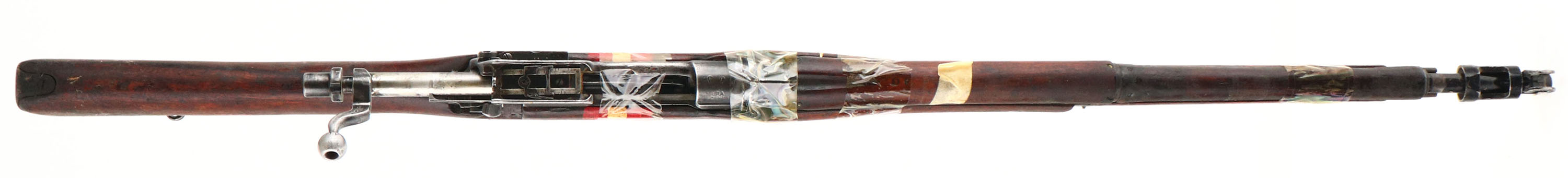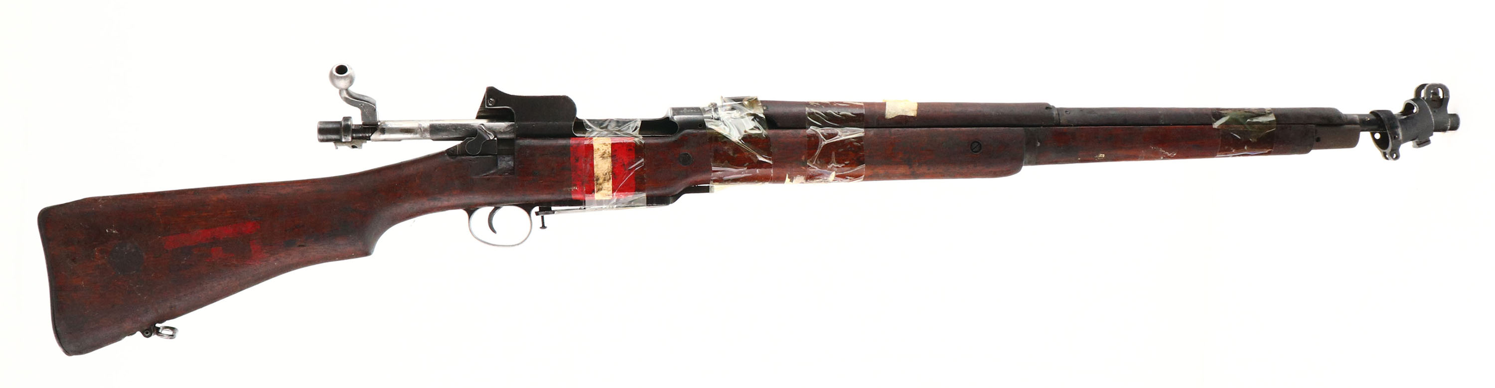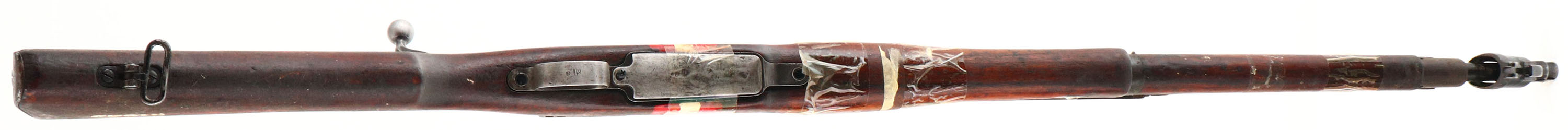 Eddystone, Model: P14 drill purpose rifle, Cal: .303 British, MFG: 1917, S/N: 494884, Bolt action rifle, 26'' barrel. The semi-pistol grip wood stock is very good with nicks, dings, scratches & wear from use/age. The stock has darkened from oils & age the mounting screws for the trigger guard & barrel bands is missing on this rifle. The stock has been painted around the magazine to indicate this a drill rifle only & not meant to be fired. Both cheeks of the stock have paint markings & faded cartouches. The metal finish rates 70% with areas of wear/thinning & areas starting to tone brown. The top of the receiver is marked with British proofs, a faint ''DP'' stamp, ''ERA'', & the S/N. the bore rating is irrelevant since a steel rod has been inserted to the chamber & welded in place ruining the barrel. The barrel holds a blade front sight with protective ears. The rear of the receiver has a elevation adjustable aperture rear sight. The stock carries a steel trapdoor buttplate. The rifle has both sling swivels but is missing the stacking swivel. These rifles were converted to drill use only for the British, they would paint the red & white strips on the guns & stamp them DP for drill purpose to signify that it was not meant to be fired. They had rods welded into chambers, firing pins clipped or sometimes nothing done to the rifle to stop it from chambering a round & firing. Even though on this rifle you can not physically chamber a round the receiver has not been touched so by ATF rules its still considered a firearm & is being sold with a FFL or C&R Req. - Value: 80 to 200