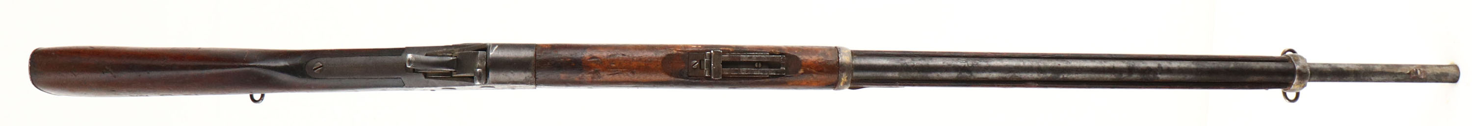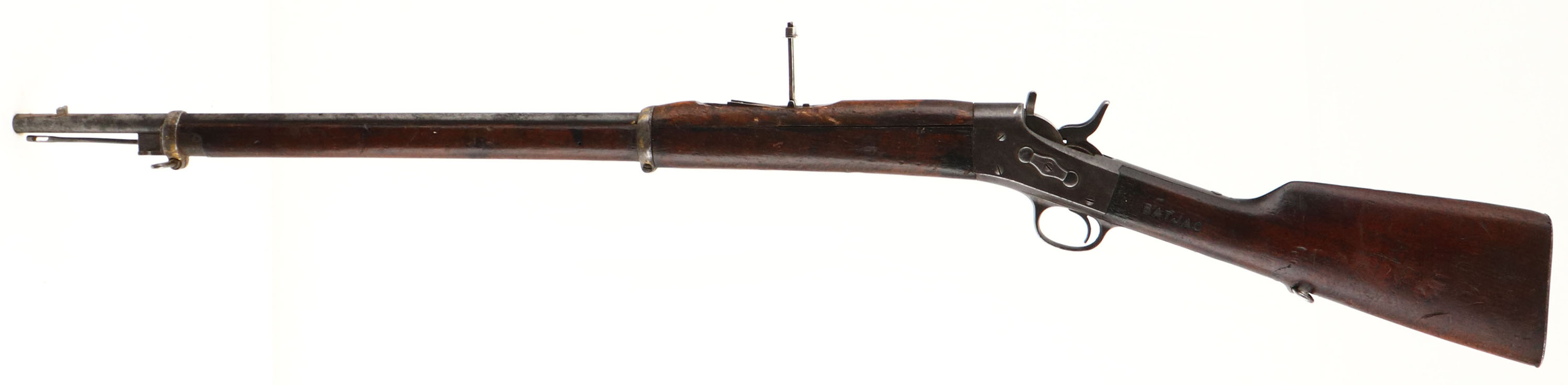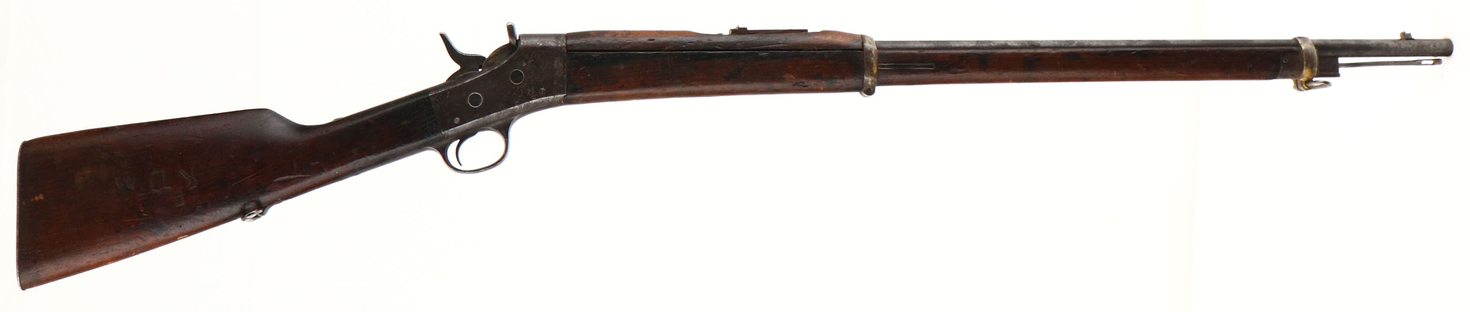 CONDITION: the straight wrist wood stock is very good with nicks, dings, dents, scratches & wear from use/age. There are a few small & tight cracks around the lower tang on the wrist as well as a small splice repair. ''BATJAC'' has been stamped into the left side of the wrist. The right cheek has ''KDM'' had etched into it. The metal has toned to a dull gray with areas of cleaned pitting & roughness, parts of the metal are starting to tone to a brown patina. There are a bunch of gouging cuts on the top of the barrel around the front sight. The top of the barrel is marked ''7M.M- S.M.''. The upper tang on the wrist is marked ''REMINGTON ARMS COMPANY ILION.N.Y.'', & a bunch of patent dates. The bore is very good. Its bright with strong rifling & spots of roughness. The front post is missing but the base is present. The barrel holds a tangent/ladder U-notch rear sight. Rifle has both sling loops & has a cleaning rod. FFL or C&R Req. - Value: 500 to 1000