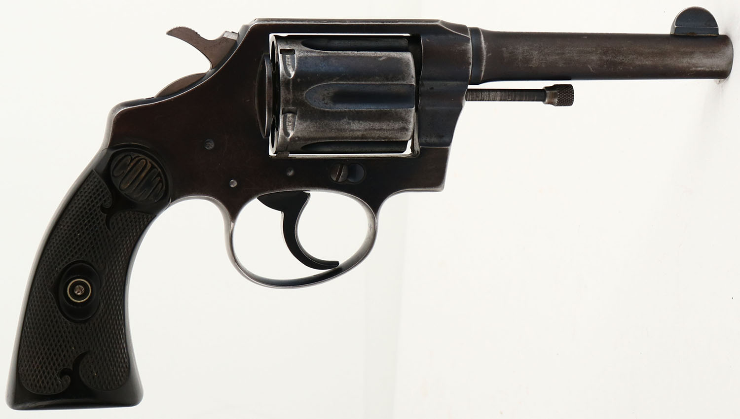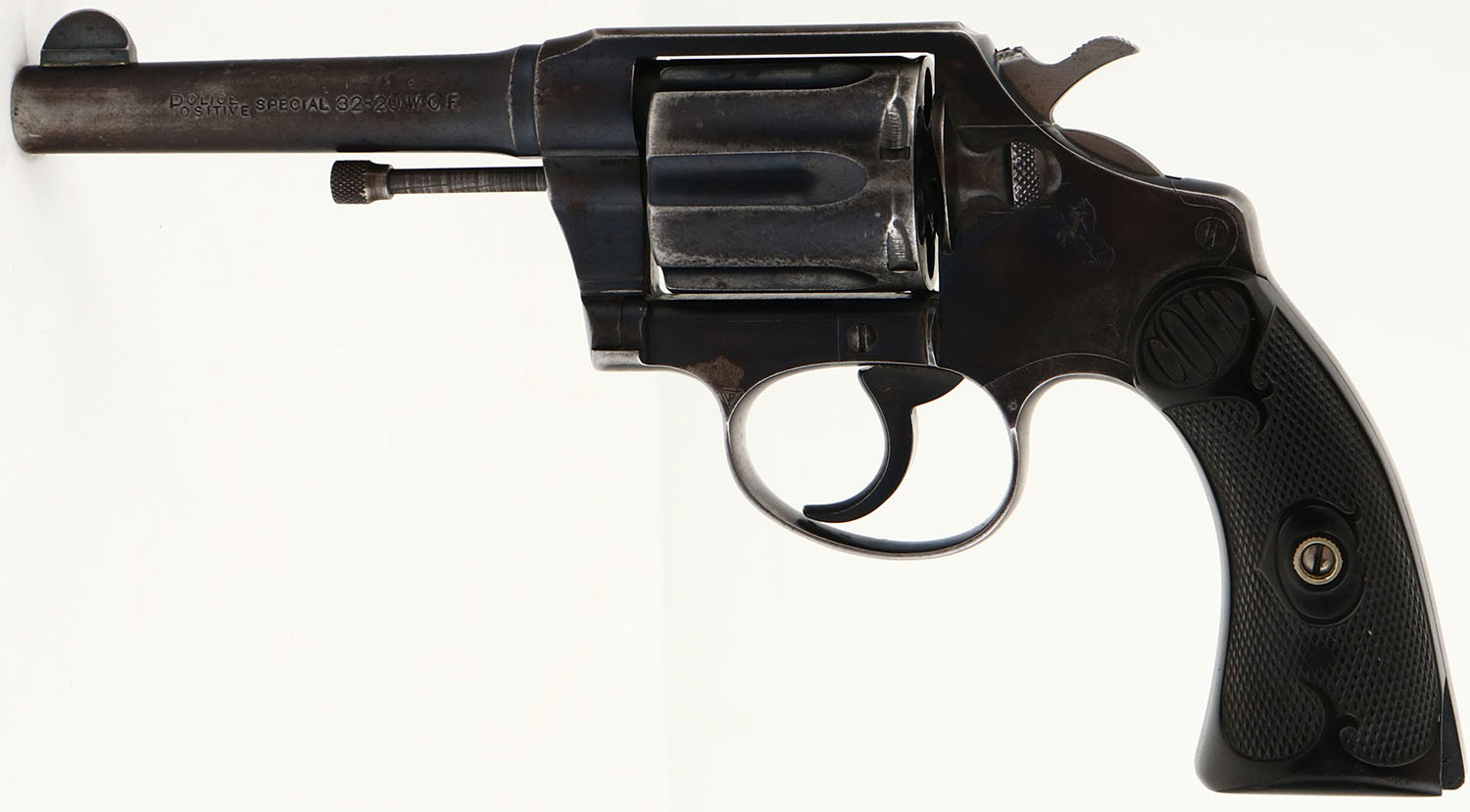 Colt, Positive Special, CAL:32-20, MFG: 1918, SN: 161129, Double Action Revolver, 4'' barrel. The top of the barrel is marked with a two line address & patent date. The left side of the barrel is marked ''POLICE POSITIVE SPECIAL 32-20 W.C.F''. The Rampant Colt logo can be seen on the left side of the frame. The butt of the revolver is marked ''W.F. & Co''. The Colt checkered hard rubber grips are very good. The bottom back corner of the left grip has an edge chip & there are minor scrapes & dings throughout. The metal blue finish rates 40% on the barrel & 50% on the frame, with areas worn to metal gray & beginning to tone to a brown patina. Bore is very good & bright, but appears grainy, with slightly thin rifling. Integral U-notch rear sight & pinched blade front sight. Internal parts/mechanical issue. The hammer does not reset after being pulled, has to be manually pushed forward to operate. SOLD AS-IS, NO RETURNS. FFL or C&R Req. - Value: 500 to 900