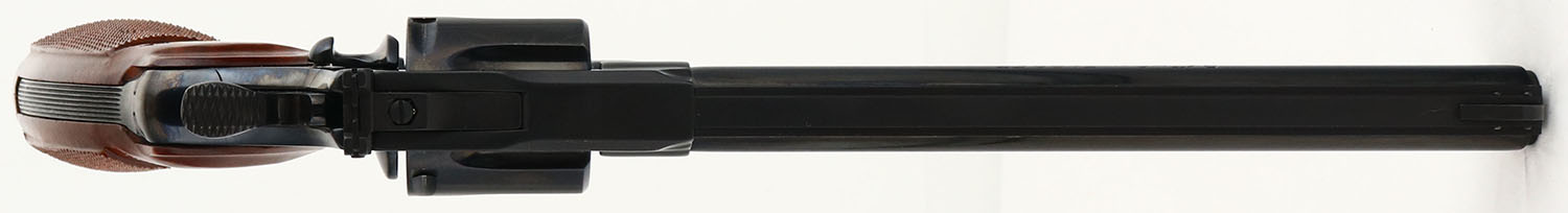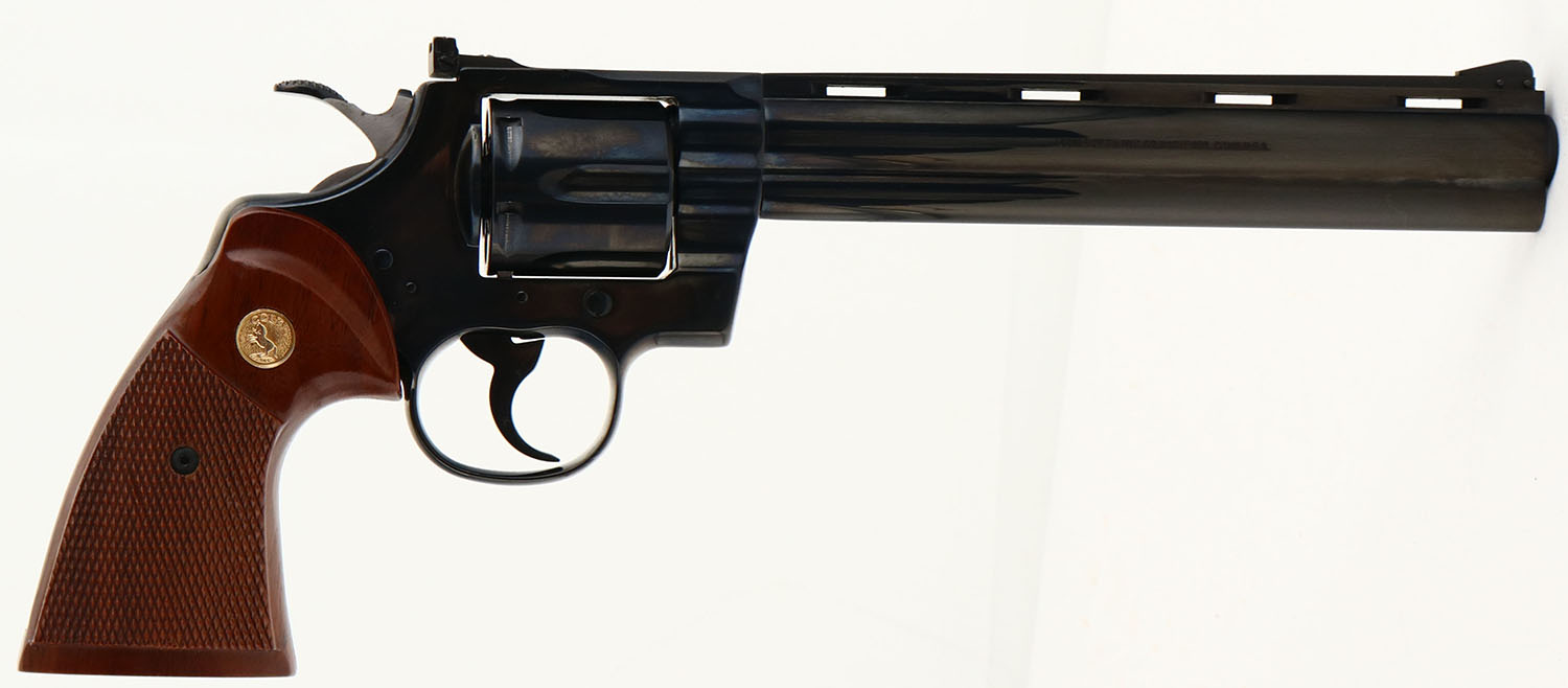 OUTSTANDING, Colt, Python Target, CAL: .38SPL, MFG: 1960, SN: LA9255, Double Action Revolver, 8'' barrel. The original Colt logo medallion checkered wood grips are near mint. The original metal blue finish rates 99% overall, with a couple minor blemishes. Bore is excellent. The frame has an adjustable rear sight & the ventilated rib holds a pinned blade front sight. This is the highest condition Python Target we have seen come through the auction. Only 3,489 mfg making this example rare. A must-have for a Colt collector. FFL or C&R Req. - Value: 3000 to 4000