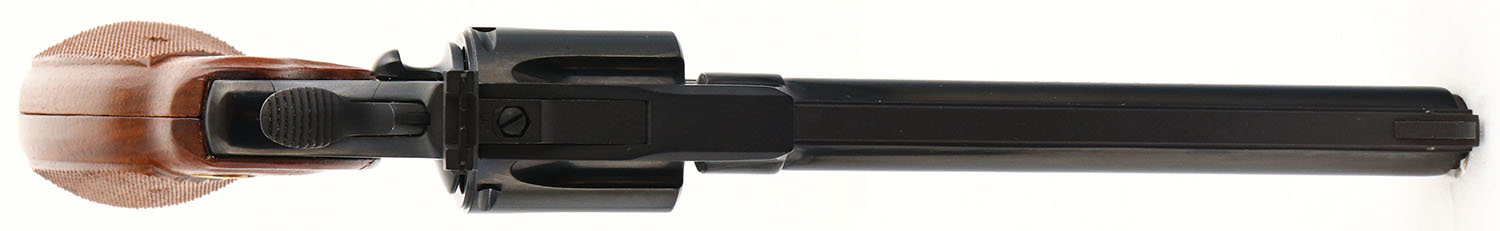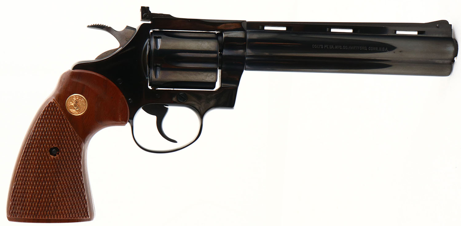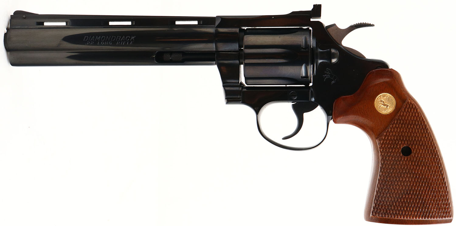 BOXED, Colt, Diamondback, CAL: 22LR, MFG: 1978/79, SN: R40797, Double Action Revolver, 6'' barrel. The Colt Diamondback was introduced as a deluxe model in 1966, inspired by the successful Colt Python, in calibers of .22 LR, .22 WMR & .38 SPL. The Diamondback is built on the smaller ''D frame'', same as used in the Detective Special. It has a 6-shot swing-out cylinder & was available in blue or nickel finishes. It has a wide serrated target hammer, ventilated rib, fully adjustable target quality sights, & full-length barrel underlug. The left side of barrel is stamped ''DIAMONDBACK .22 LONG RIFLE''. They came with Gold tone Colt medallions in the checkered Walnut grips. The grips on this example are excellent, with a small glue repaired edge chip on the top front side of the right grip. The high polish blued finish rates 99%. Bore is near mint. The satin finished top of the ventilated rib barrel holds a screw height adjusting ''U'' notch rear sight & front blade sight. Original hang tag still present on the trigger guard. Comes in the original SN matching Colt wood grain box, with related paperwork. Box has some edge, corner & shelf wear. A highly collectible Colt revolver. FFL Req. - Value: 1500 to 2000