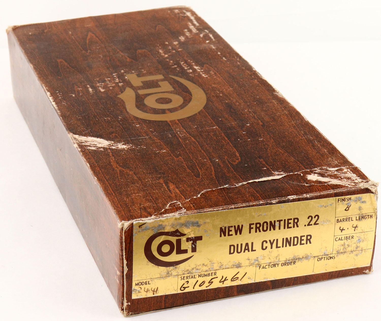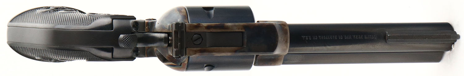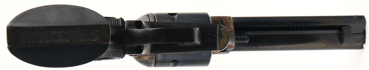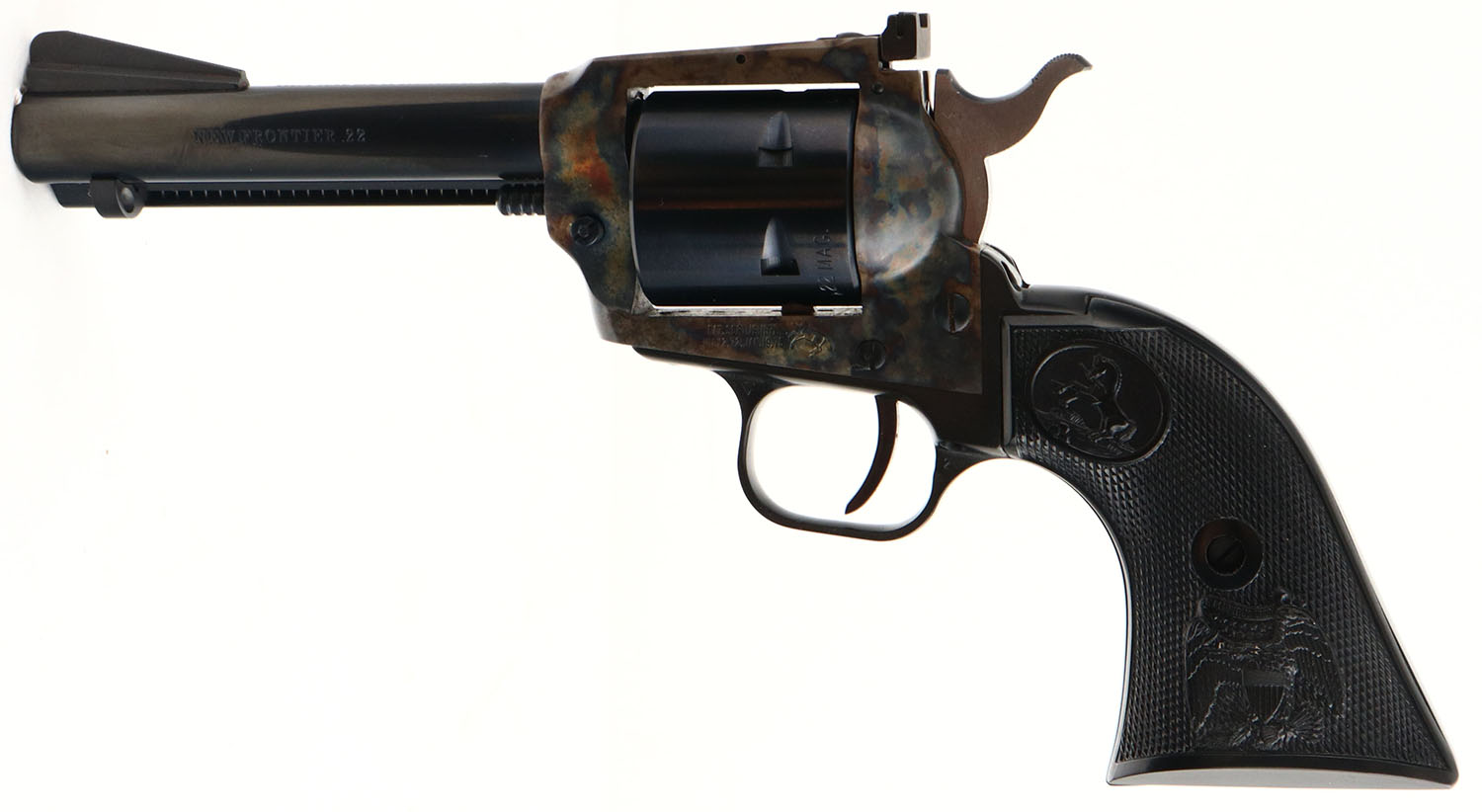 BOXED, Colt, New Frontier .22, CAL: .22 MAG, MFG: 1974, SN: G105461, Single Action Revolver, 4 3/8'' barrel. This variation features similar features to the Peacemaker 22, but has a flat-top frame, ramp front & adjustable rear sight. The top of the barrel is marked ''COLTS PT. F.A. MFG. Co. HARTFORD, CT. U.S.A.'', the left side is marked ''NEW FRONTIER .22'', the left side of the frame is marked with a two line patent date, ahead of the Rampant Colt logo. The Rampant Colt & E. Pluribus Unum checkered plastic grips are mint. The metal blue finish on the barrel, cylinder & trigger guard rates 99% & the case-hardened frame retains excellent & vivid case-colors. Bore is near mint. Factory adjustable square notch rear sight & serrated blade front sight. Comes in original SN matching wood grain box, with extra .22 MAG cylinder. A desirable & collectible Colt revolver. FFL or C&R Req. - Value: 600 to 1000