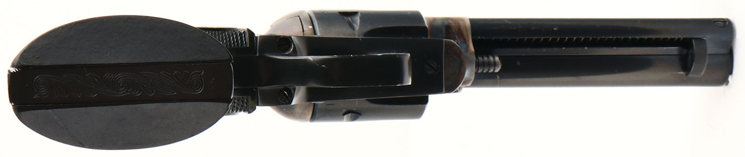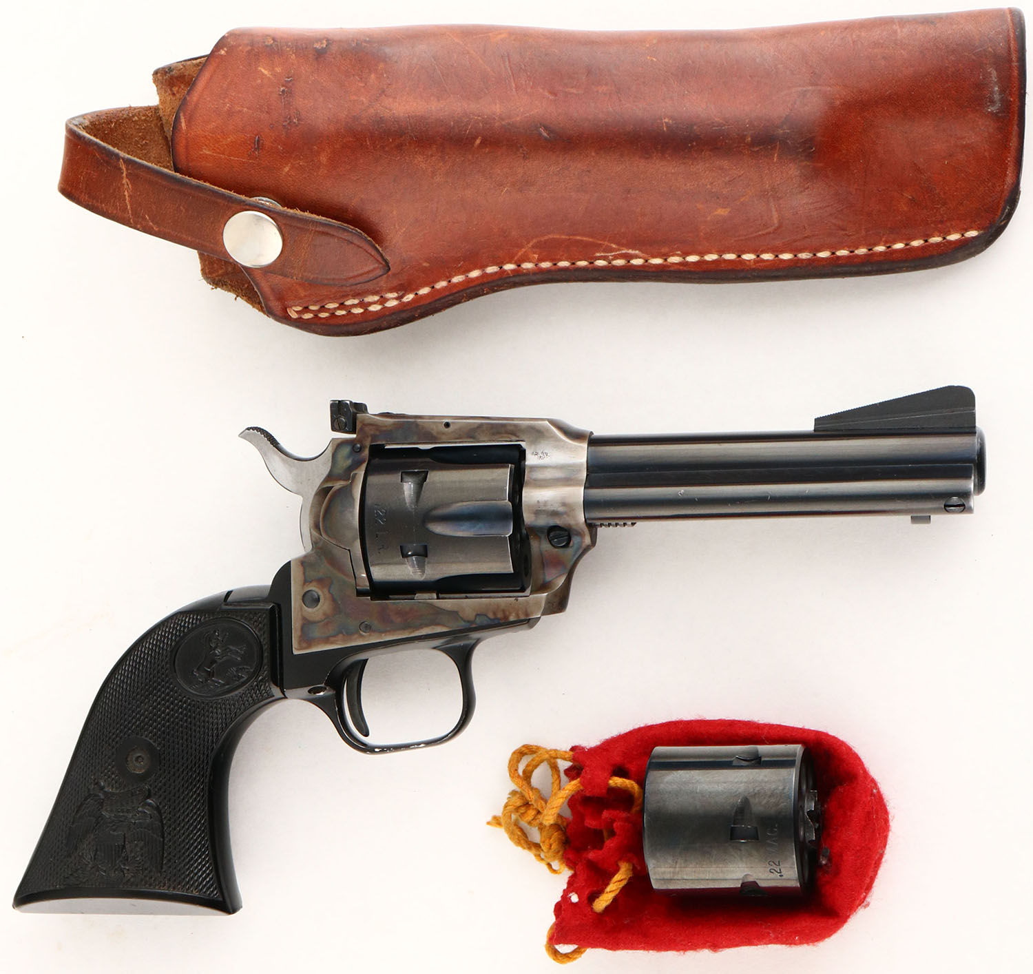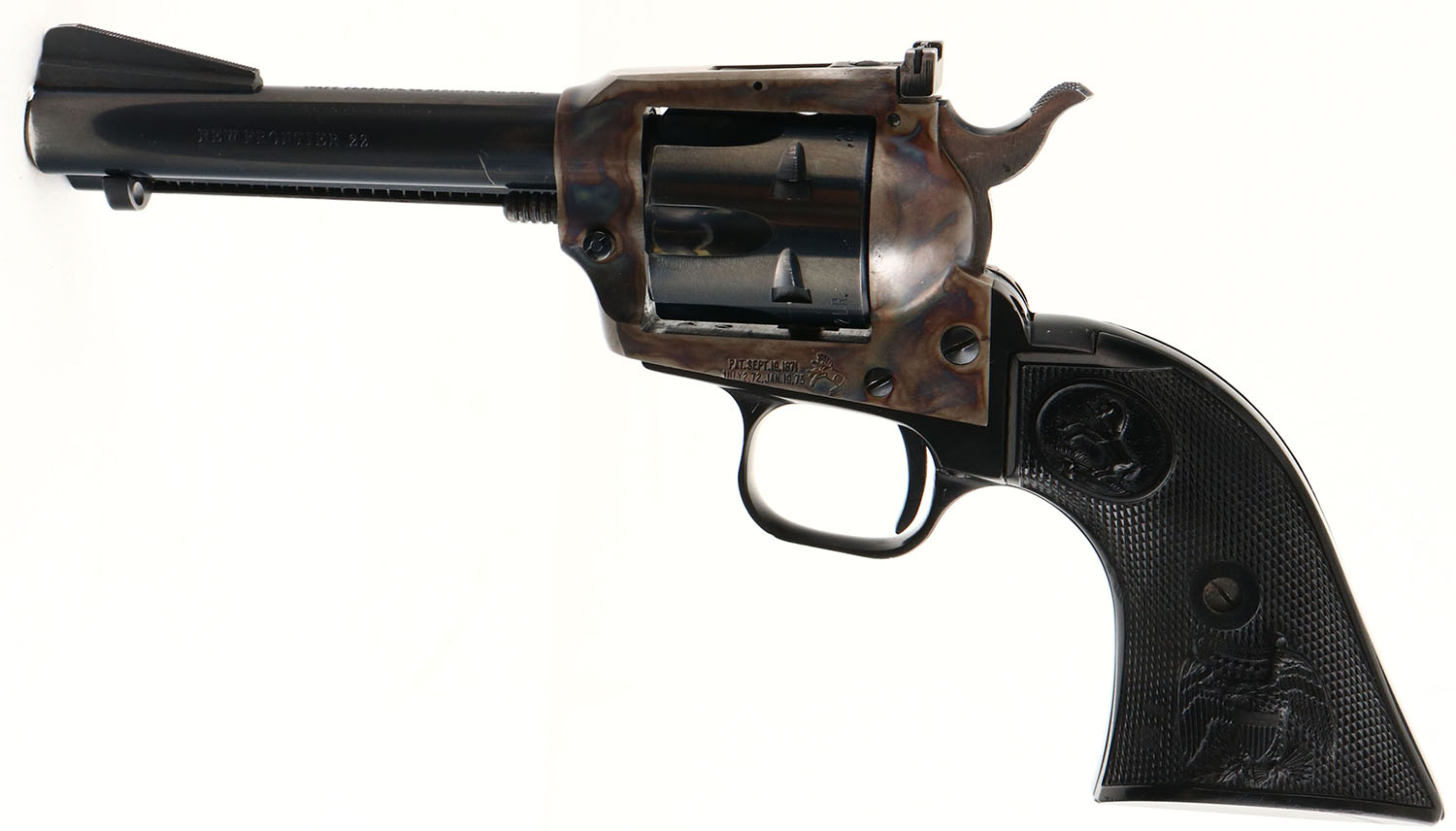 Colt, New Frontier .22, CAL: .22LR/.22MAG, MFG: 1974, SN: L22245, Single Action Revolver, 4 1/4'' barrel. The Rampant Colt & E.Pluribus Unum checkered plastic grips are excellent, with minor handling marks. The metal blue finish on the barrel rates 95%, cylinder rates 98% & the trigger guard rates 97%. The case-hardened frame retains excellent case-colors. Bore is excellent. Square notch rear sight & long serrated blade front sight. Comes with .22 MAG cylinder in red pouch & Bianchi leather holster. FFL or C&R Req. - Value: 400 to 600