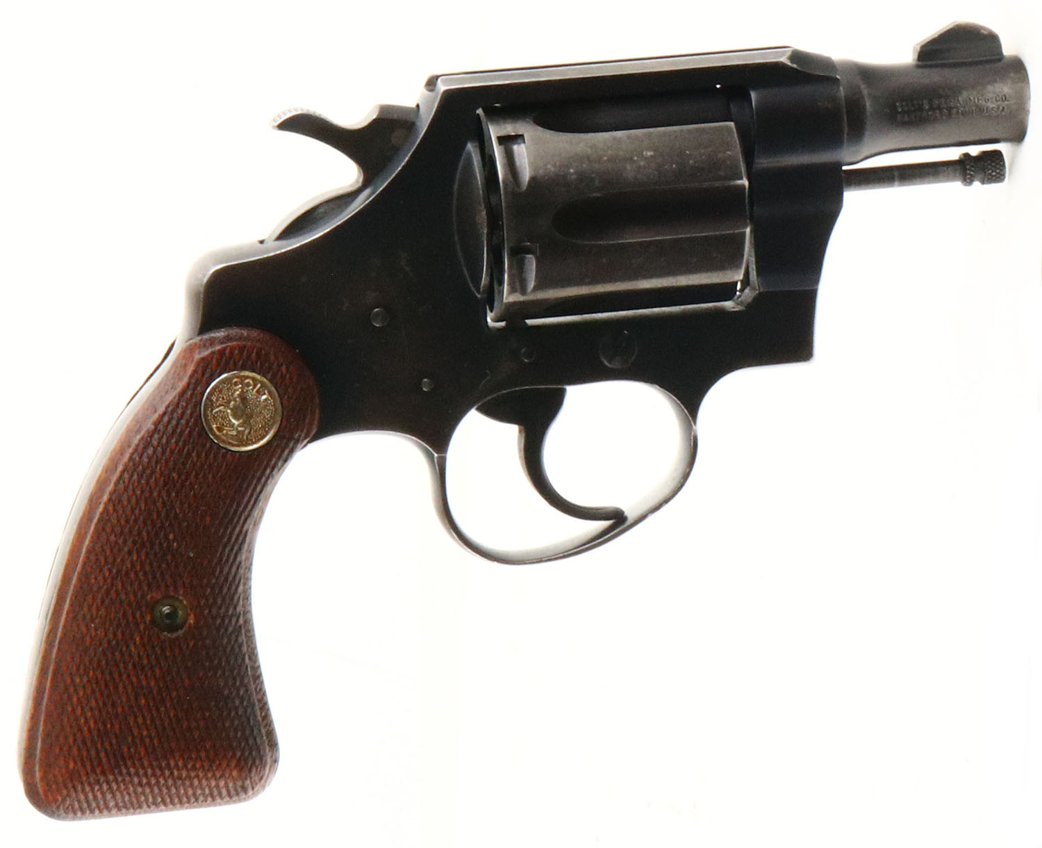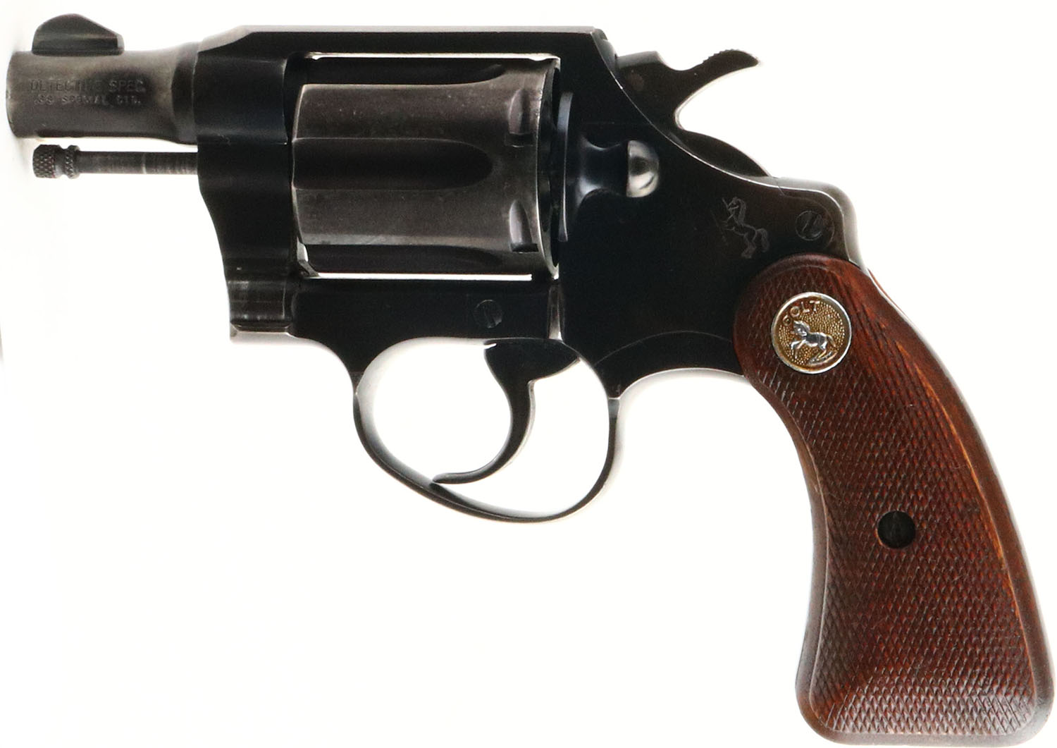 Colt, Detective Special - Post War 2nd Issue, CAL: .38 SPL, MFG: 1956, SN: 689679, Double Action Revolver, 2'' barrel. The Colt logo medallion checkered wood grips are very good & solid. There is a smoothed sliver chip on the right grip next to the front strap, alongside other minor handling marks & an added coat of protective oils. The original metal blue finish rates 80% on the barrel & 70% on the frame, with areas of thinning toned to a brown patina. Bore is excellent. Square notch rear sight & serrated blade front sight. FFL or C&R Req. - Value: 400 to 700