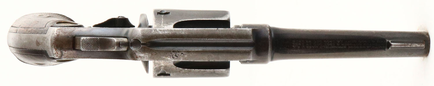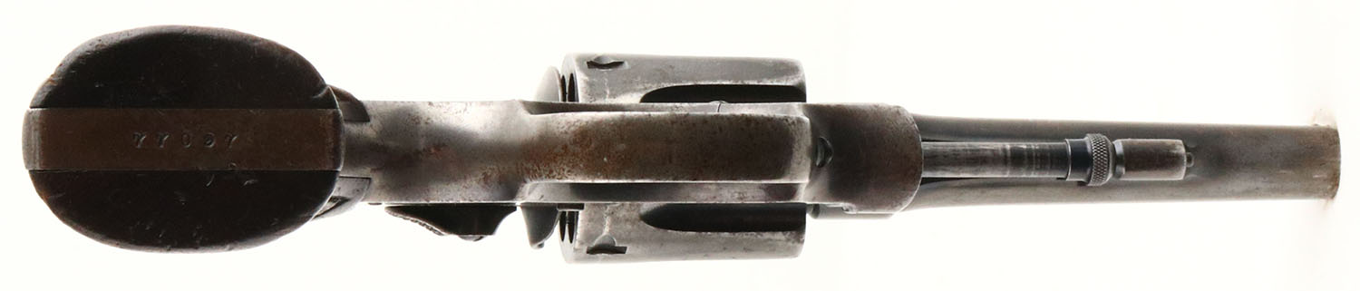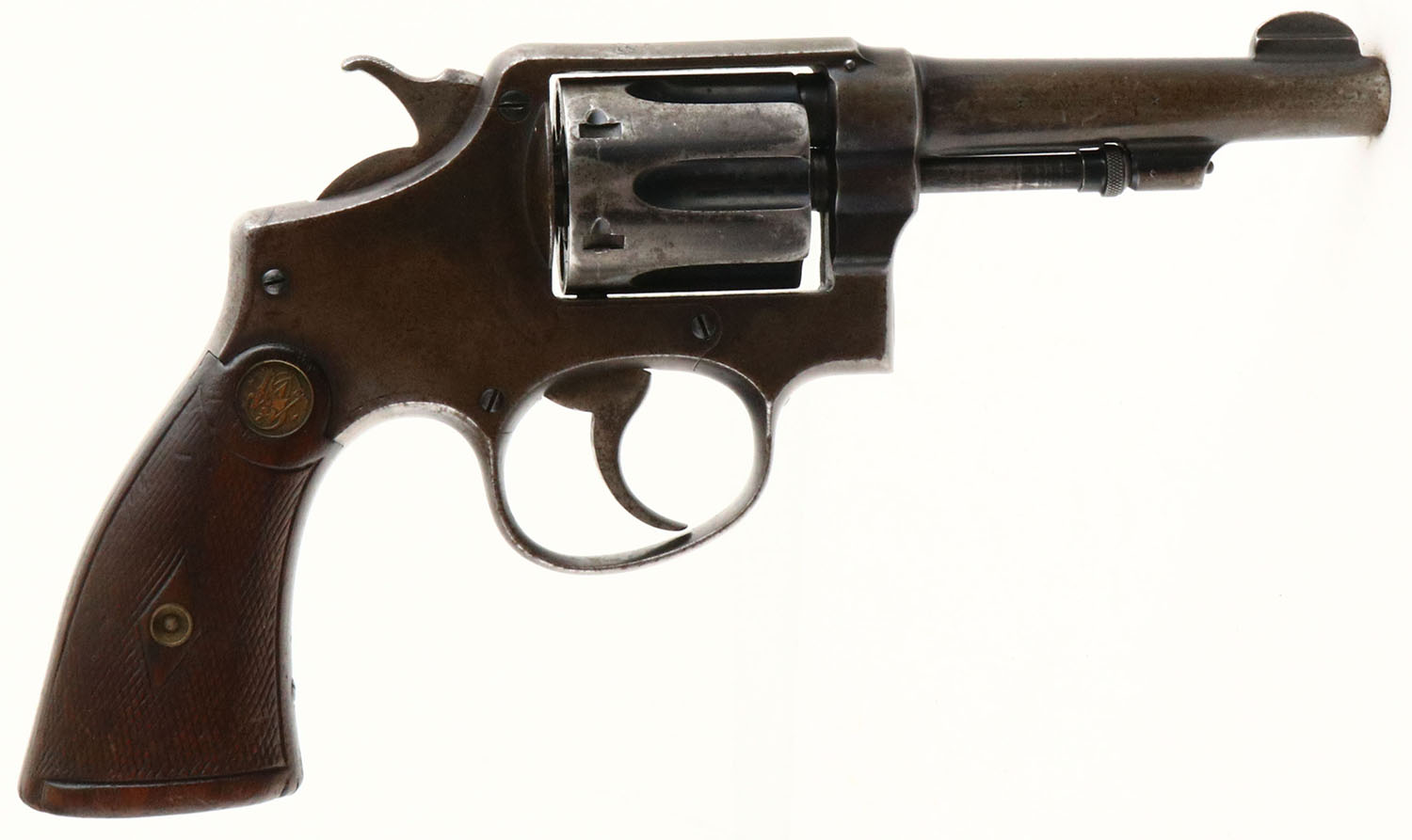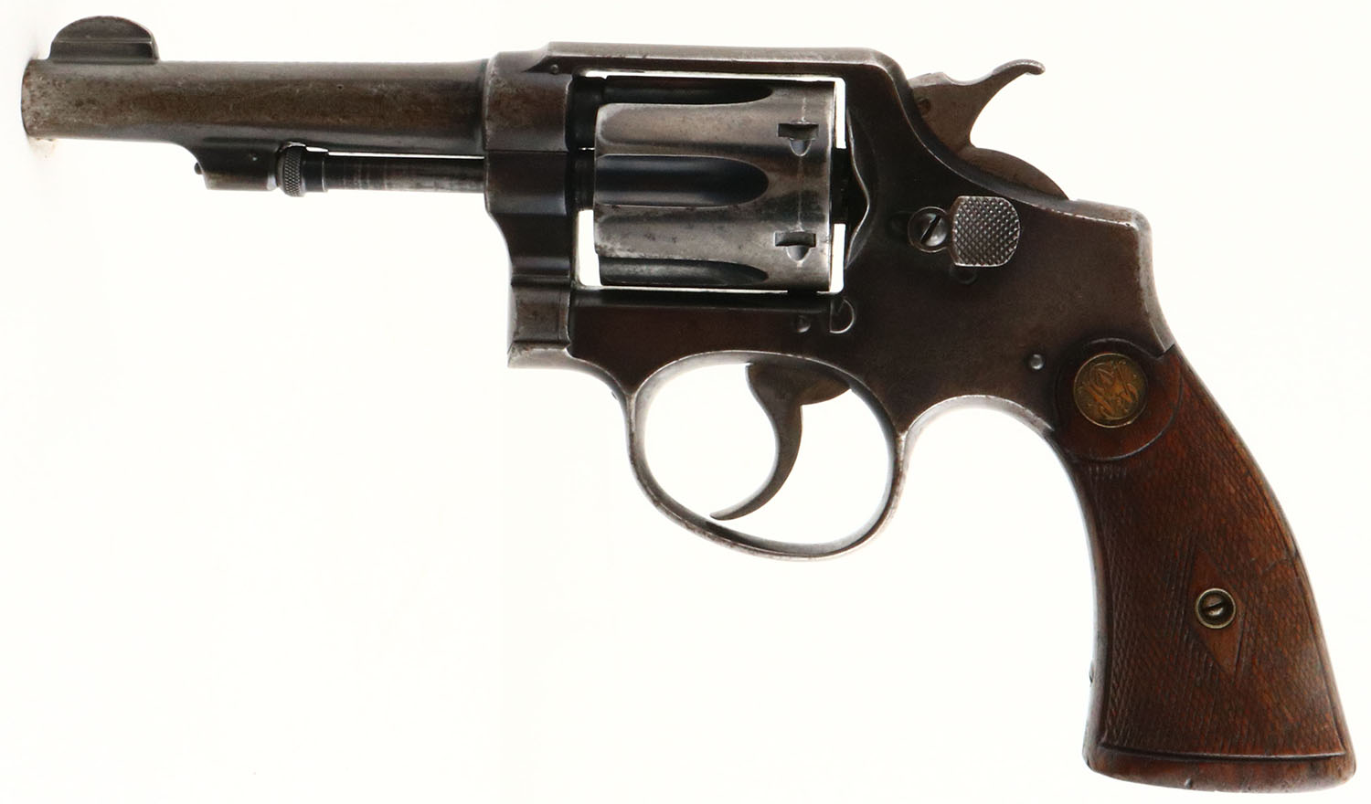 Smith & Wesson, .32-20 Hand Ejector Model of 1905 4th Change, CAL: .32 WCF (.32-20), MFG: 1915-1920, SN: 77097, Double Action Revolver, 4'' barrel. The S&W logo medallion diamond checkered wood grips are very good. The checkering is worn smooth & there are contusions, scrapes & dings. The original metal blue finish rates 40% on the barrel & 30% on the frame, worn to metal gray & toned to a brown patina. Bore is excellent & bright, but has consistent roughness amongst strong rifling. ''U'' notch rear sight & squared blade front sight. FFL or C&R Req. - Value: 250 to 500
