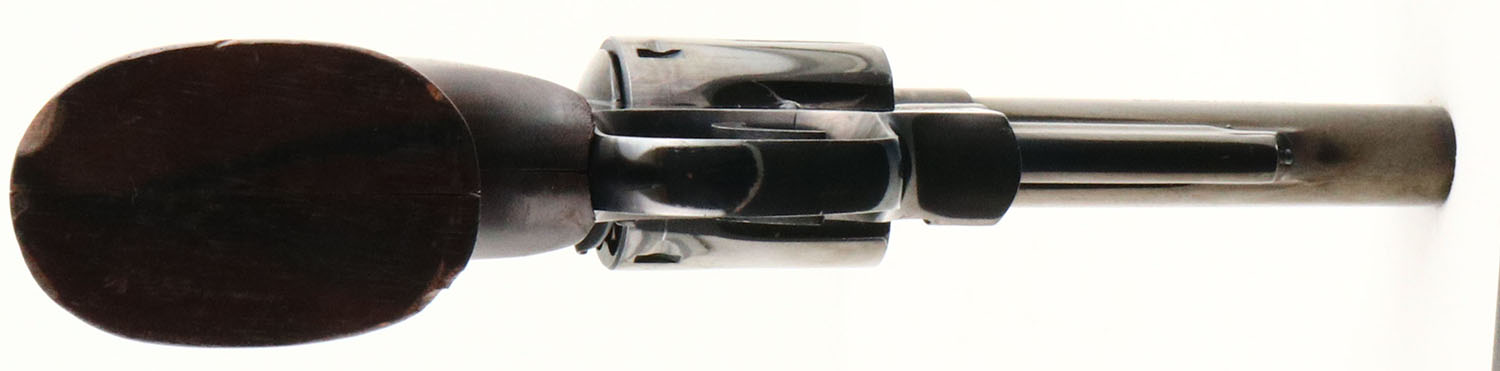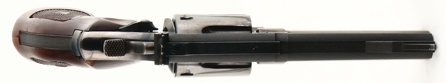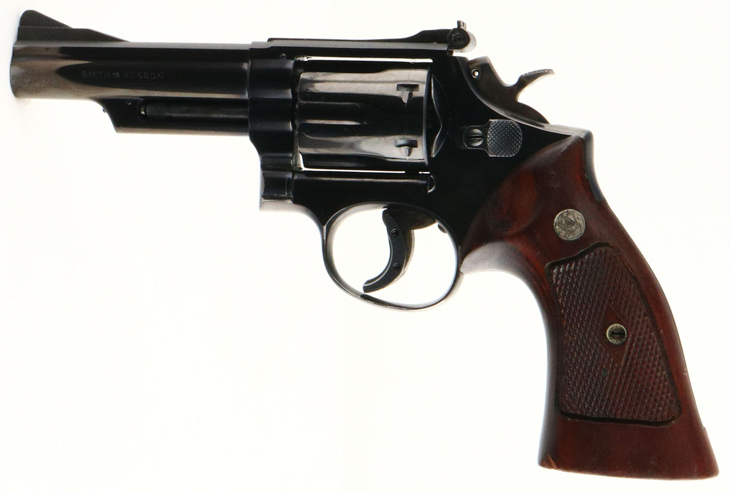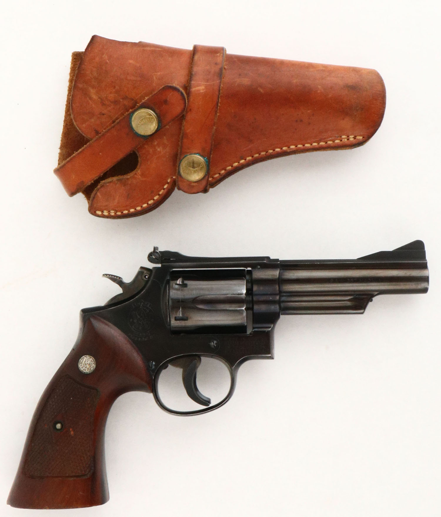 Smith & Wesson, Model 19-2, CAL: 357 MAG, MFG: 1965, SN: K650490, Double Action Revolver, 4'' barrel. The S&W logo medallion checkered wood grips are very good & solid. There are multiple small edge chips, along with scrapes & dings to the finish. The metal blue finish rates 97% overall. Case-hardened hammer & trigger retain excellent case-colors. Bore is excellent, with frosting & light spotting near the muzzle. Adjustable square notch rear sight & ramp elevated serrated blade front sight. Trigger shoe. Comes with Hunter brand leather holster. FFL or C&R Req. - Value: 600 to 900
