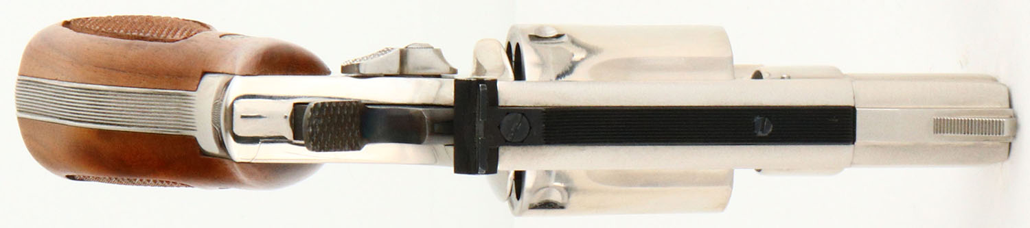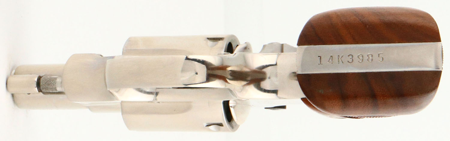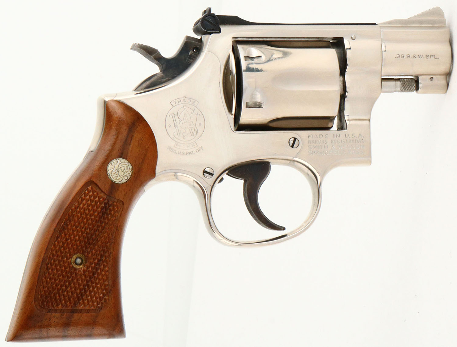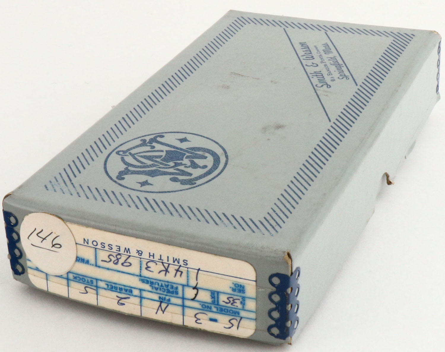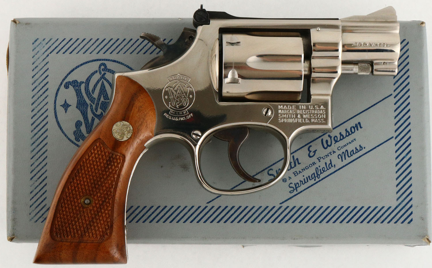 BOXED, Smith & Wesson, Model 15-3, CAL: 38 S&W SPL, MFG: 1977, SN: 14K3985, Double Action Revolver, 2'' barrel. The S&W logo checkered wood grips are mint. The original nickel finish is excellent overall, with visible thin brush lines, consistent with nickel finishes. The case-hardened trigger & hammer retain excellent case-colors. Bore is excellent. Adjustable rear sight & serrated blade front sight. Comes in factory SN matching box, with related paperwork, tool & cleaning rod/brushes. A nearly new example of a nickel 15-3. FFL Req. - Value: 600 to 800