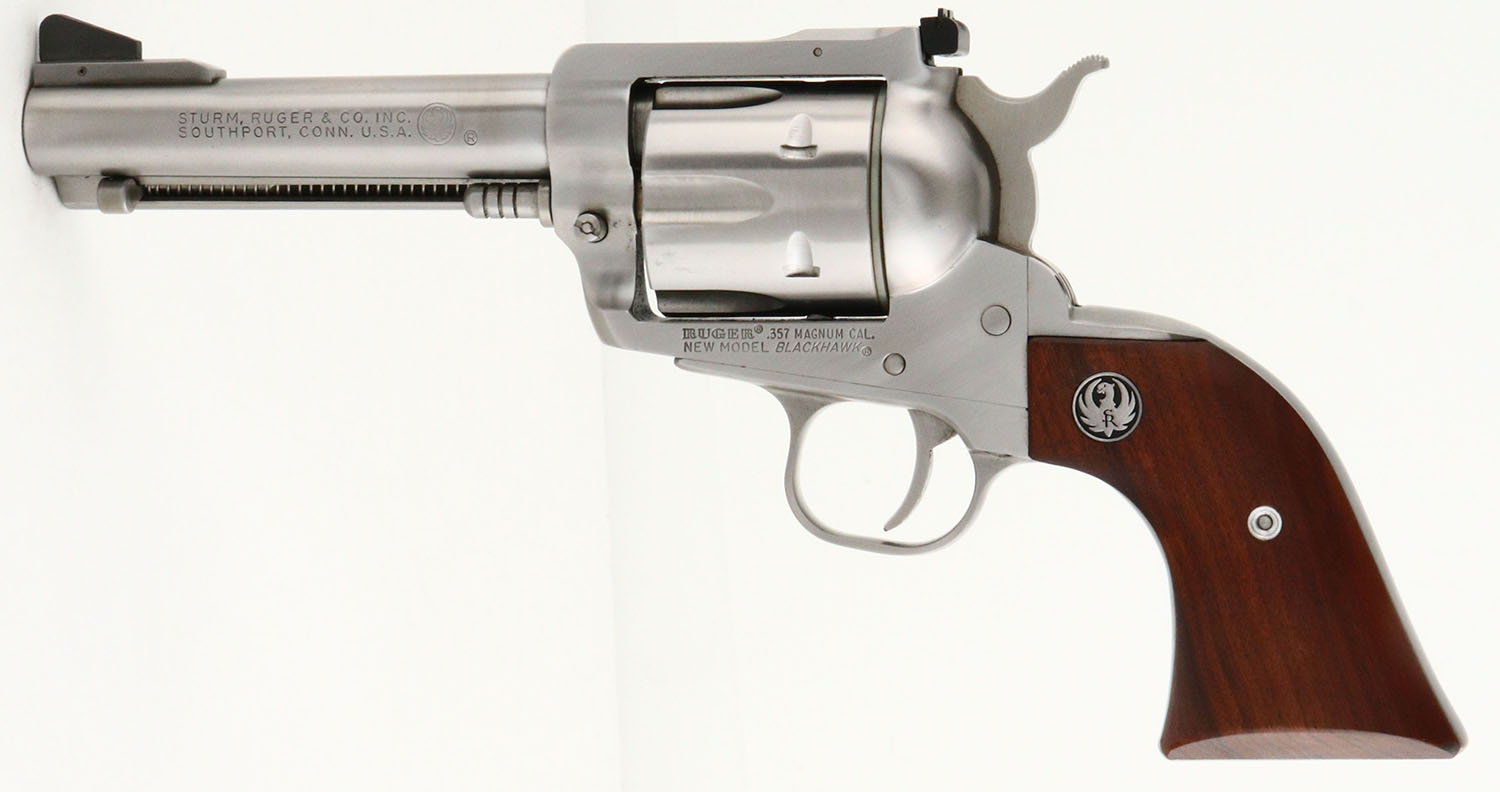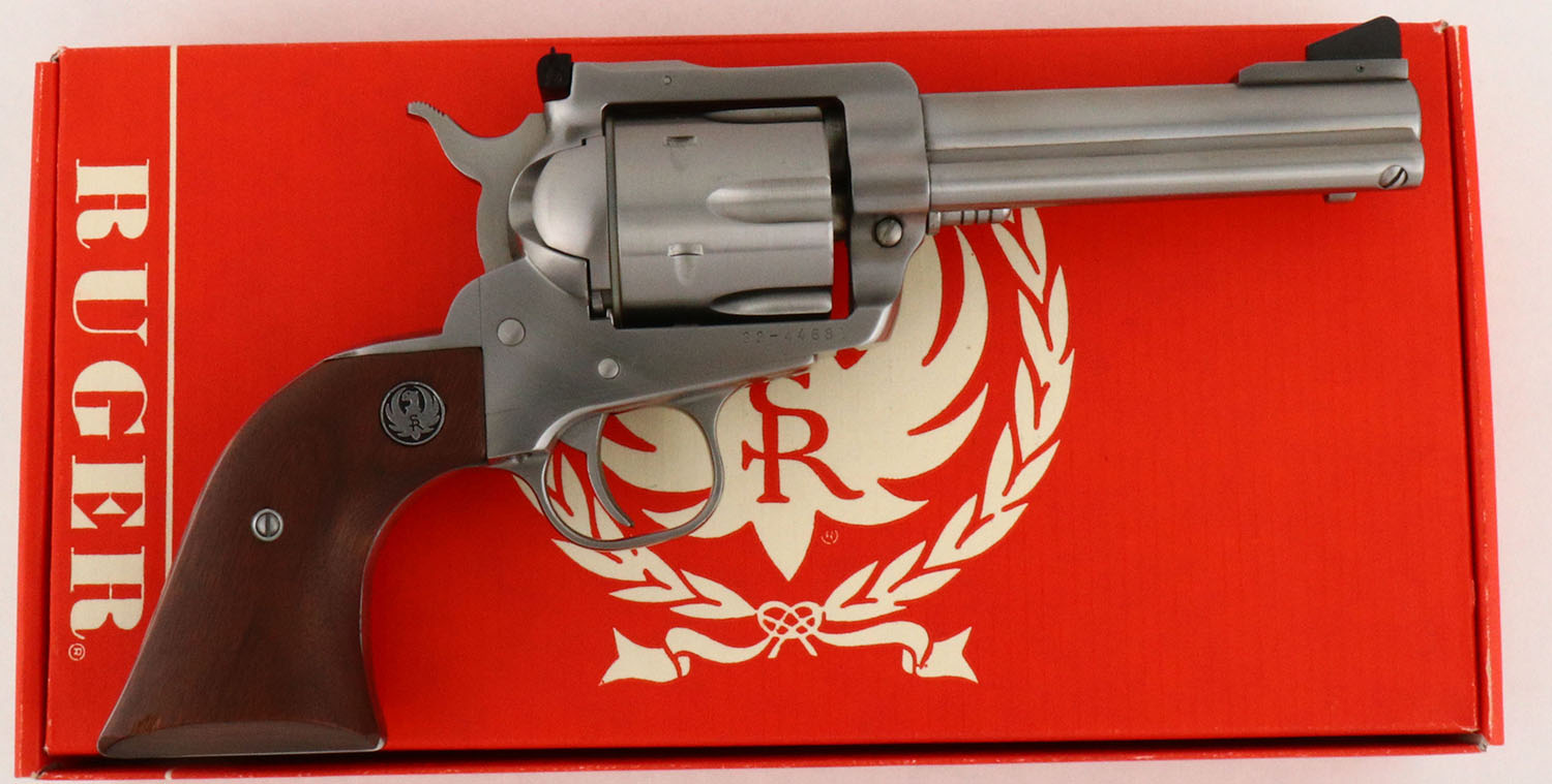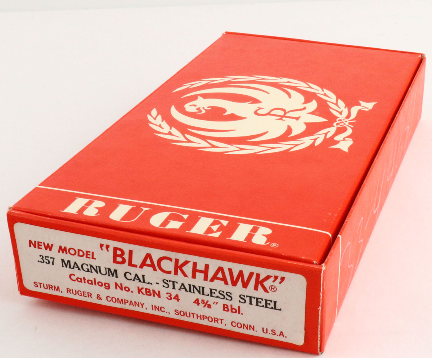 BOXED, Ruger, New Model Blackhawk, CAL: 357 MAG, MFG: 1976, SN: 33-44681, Single Action Revolver, 4 5/8'' barrel. The Ruger logo medallion wood grips are mint. The stainless steel finish is excellent. Bore is mint. Adjustable rear sight & elevated serrated blade front sight. The plastic cylinder disc is still present. Comes in factory SN matching box, with related paperwork, original packaging & outer cardboard sleeve. FFL Req. - Value: 600 to 900