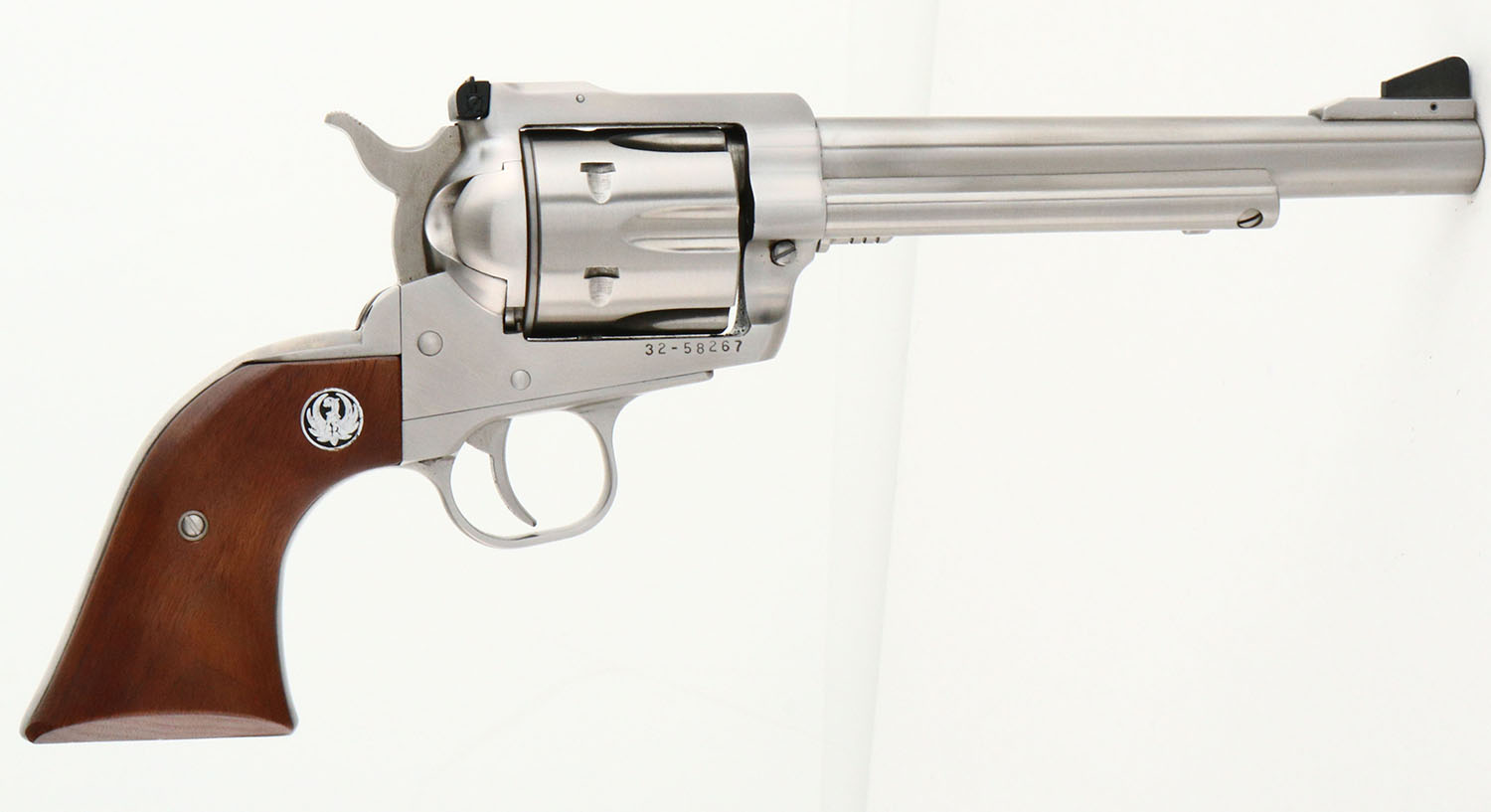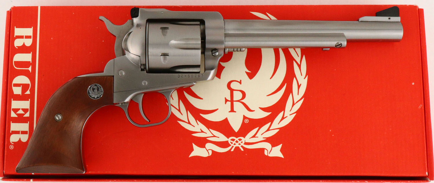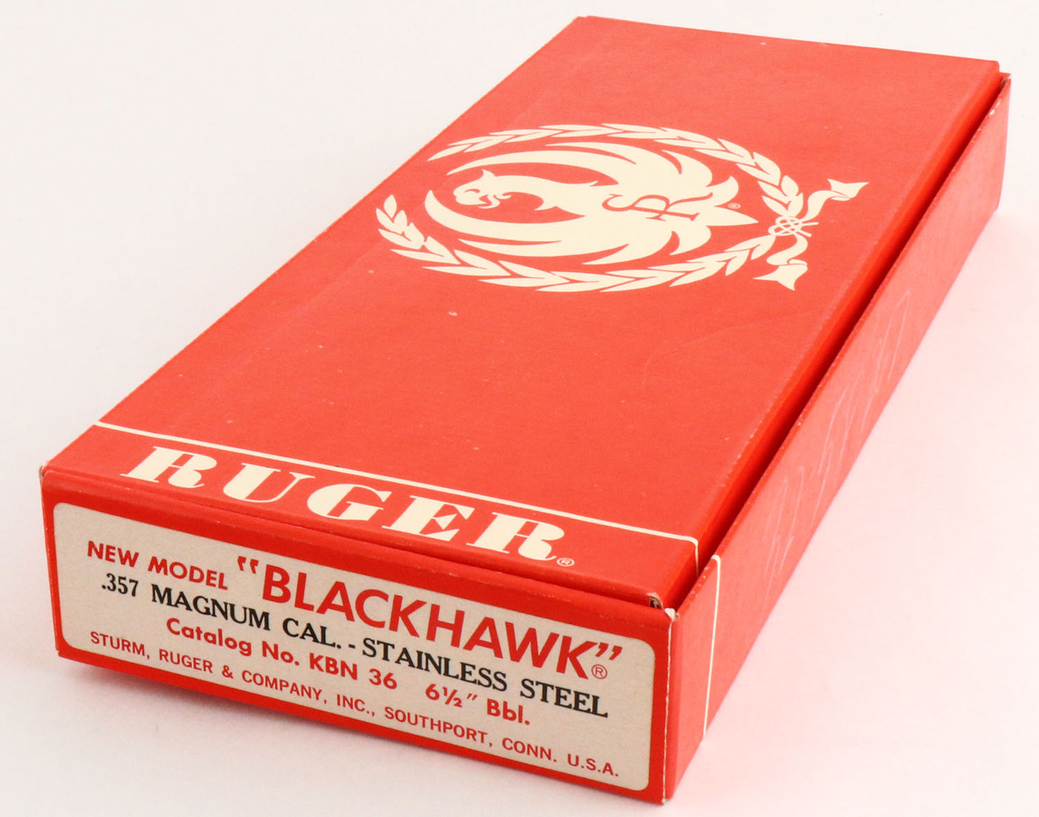 BOXED, Ruger, New Model Blackhawk, CAL: .357 MAG, MFG: 1974, SN: 32-58267, Single Action Revolver, 6 1/2'' barrel. The Ruger logo medallion wood grips are mint. The stainless steel finish is excellent. Bore is mint. Adjustable rear sight & elevated blade front sight. Comes in factory SN matching box & outer cardboard sleeve. The plastic cylinder disc is still present. Additionally, comes with original purchase receipt from 1974. NOS. NIB. FFL or C&R Req. - Value: 600 to 900