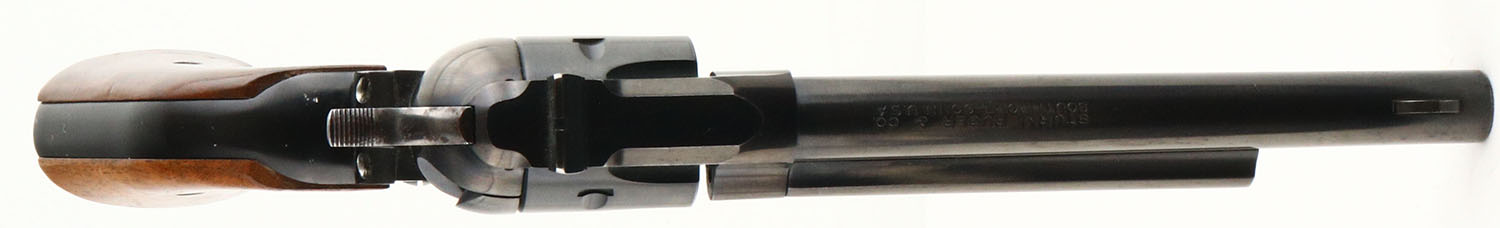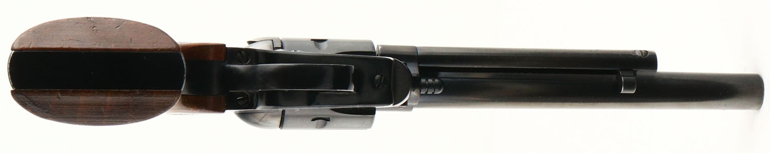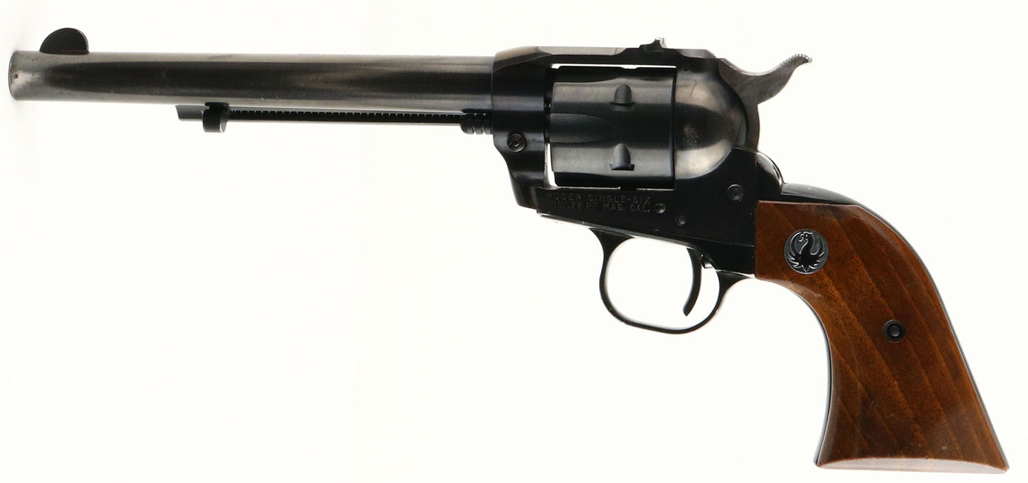 Ruger, Single Six, CAL: 22 MRF, MFG: 1961, SN: 309224, Single Action Revolver, 6 1/2'' barrel. The Ruger logo medallion wood grips are very good & solid. There are multiple small contusions, dings & a few spots of flaking to the finish. The metal blue finish on the barrel rates 90%, with holster wear & thinning toned to a brown patina. The frame rates 95%, with edge wear & holster wear on cylinder shoulders & loading gate. Bore is excellent. Square notch rear sight & serrated blade front sight. FFL or C&R Req. - Value: 300 to 600