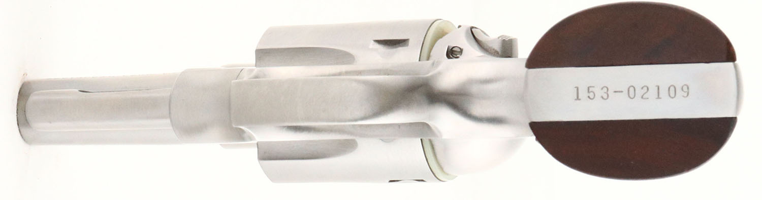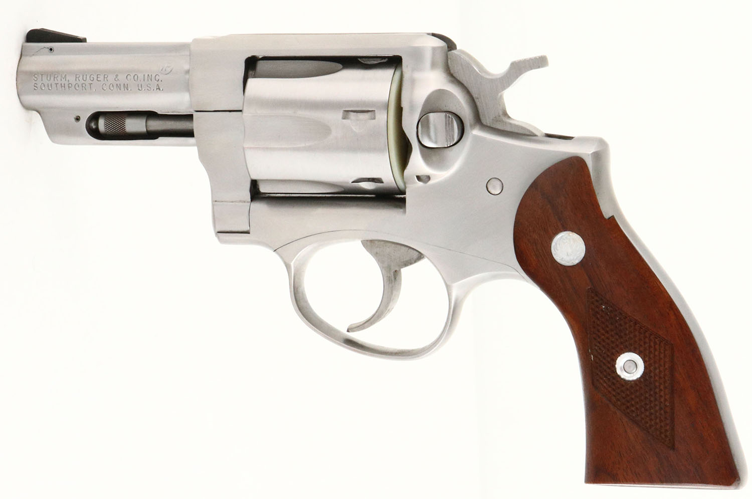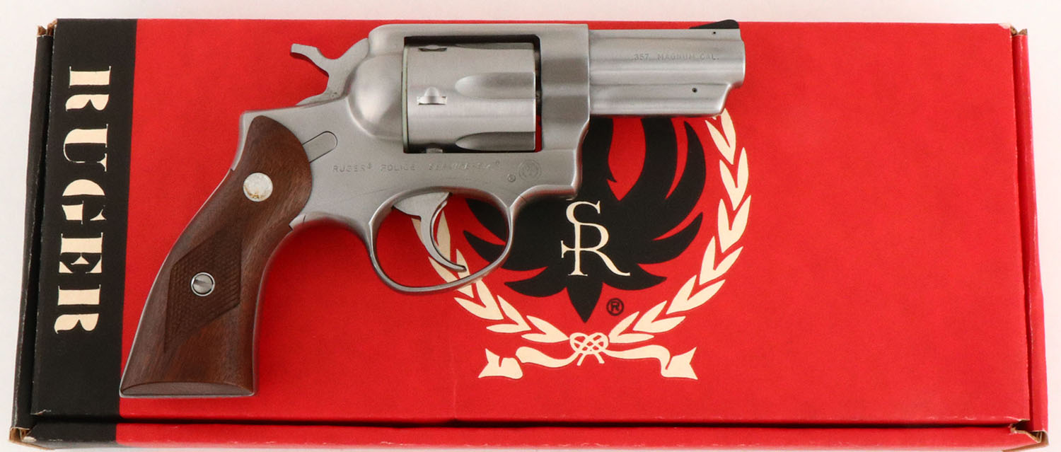 NEW BOXED, Ruger, Police Service-Six, CAL: 357 MAG, MFG: 1977, SN: 153-02109, Double Action Revolver, 2 3/4'' barrel. The Ruger logo medallion checkered wood grips are mint. The stainless steel finish is excellent. Bore is mint. Square notch rear sight & serrated blade front sight. The plastic cylinder disc is still present. Comes in factory SN matching box, with related paperwork & original packaging materials. NOS. NIB. FFL Req. - Value: 450 to 650