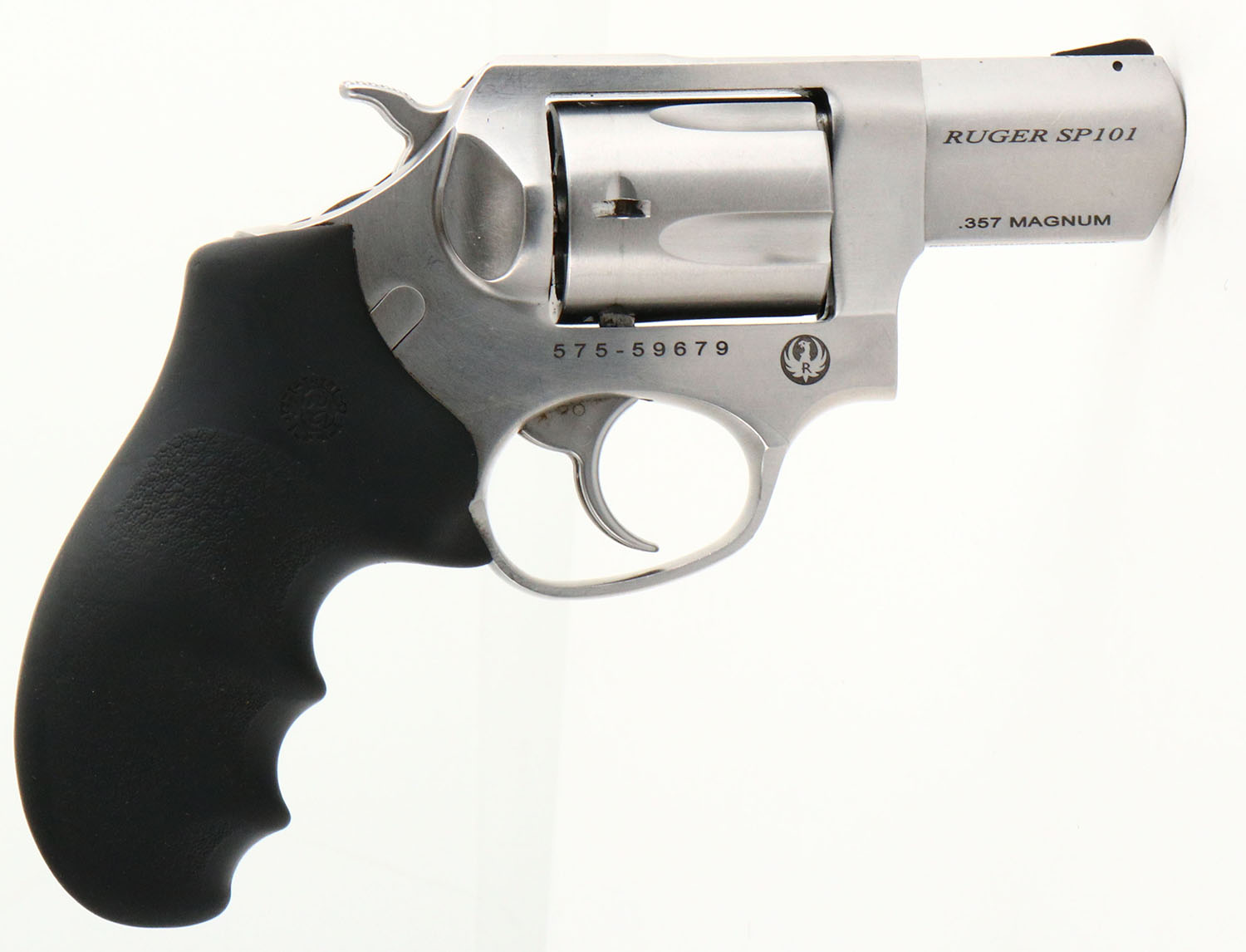 Ruger, SP101, CALL 357 MAG, MFG: 2014, SN: 575-59679, Double Action Revolver, 2 1/4'' barrel. The upgraded stippled Hogue rubber grips are very good, some stippling is worn smooth. The stainless steel finish is good, with consistent visible brush lines & scrapes throughout. Bore is excellent. Square notch rear sight & serrated blade front sight. FFL Req. - Value: 300 to 600
