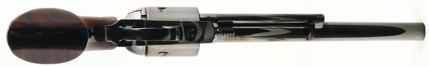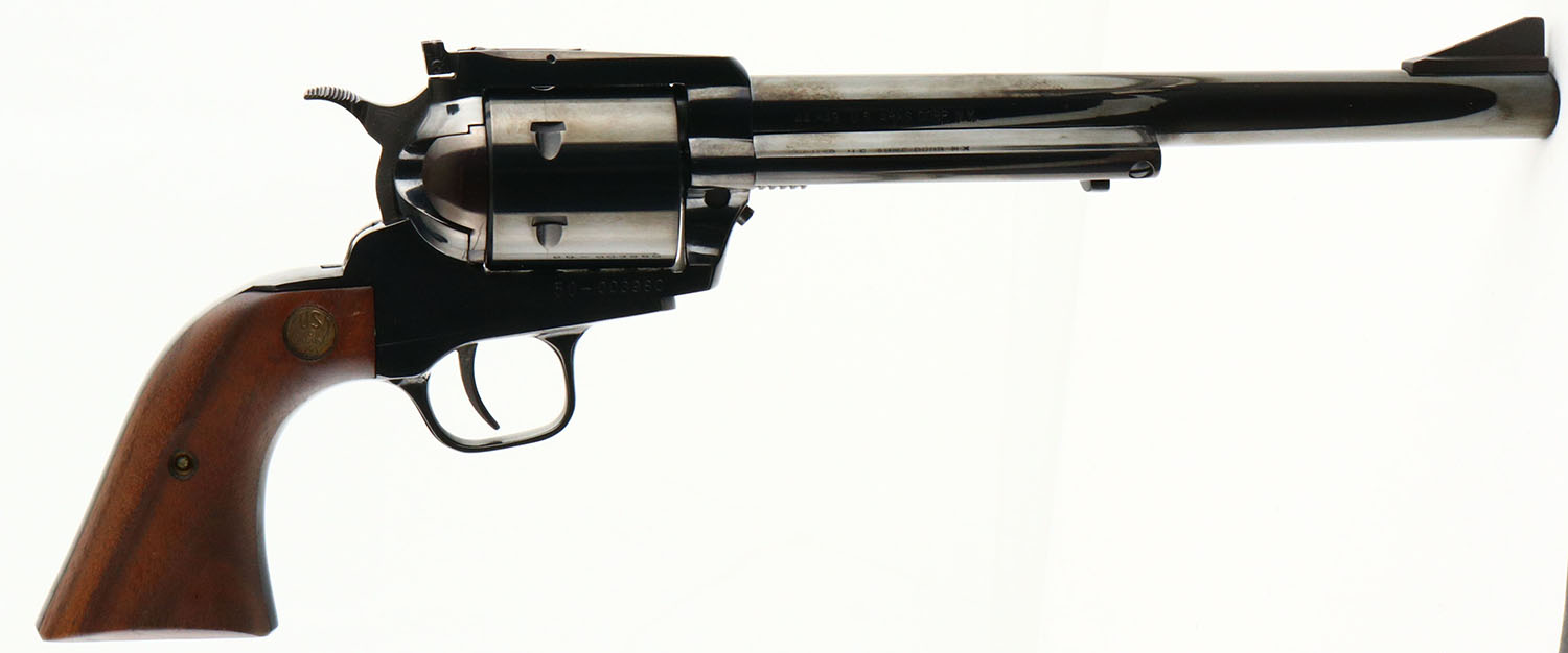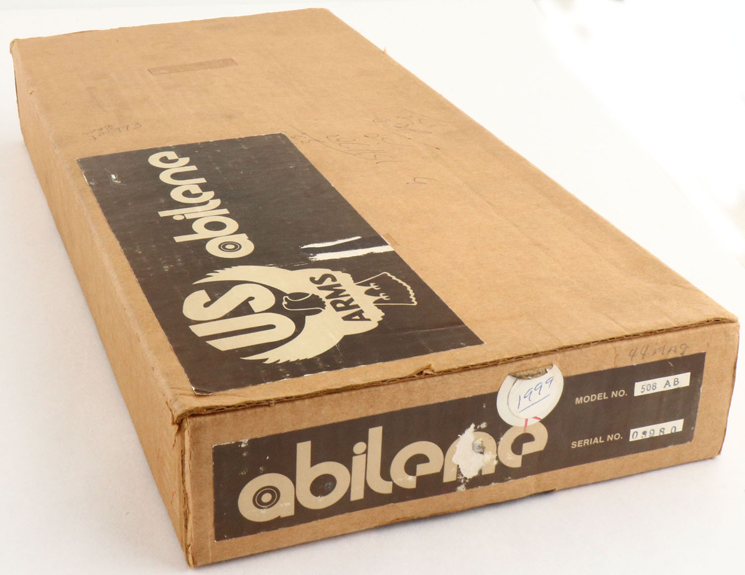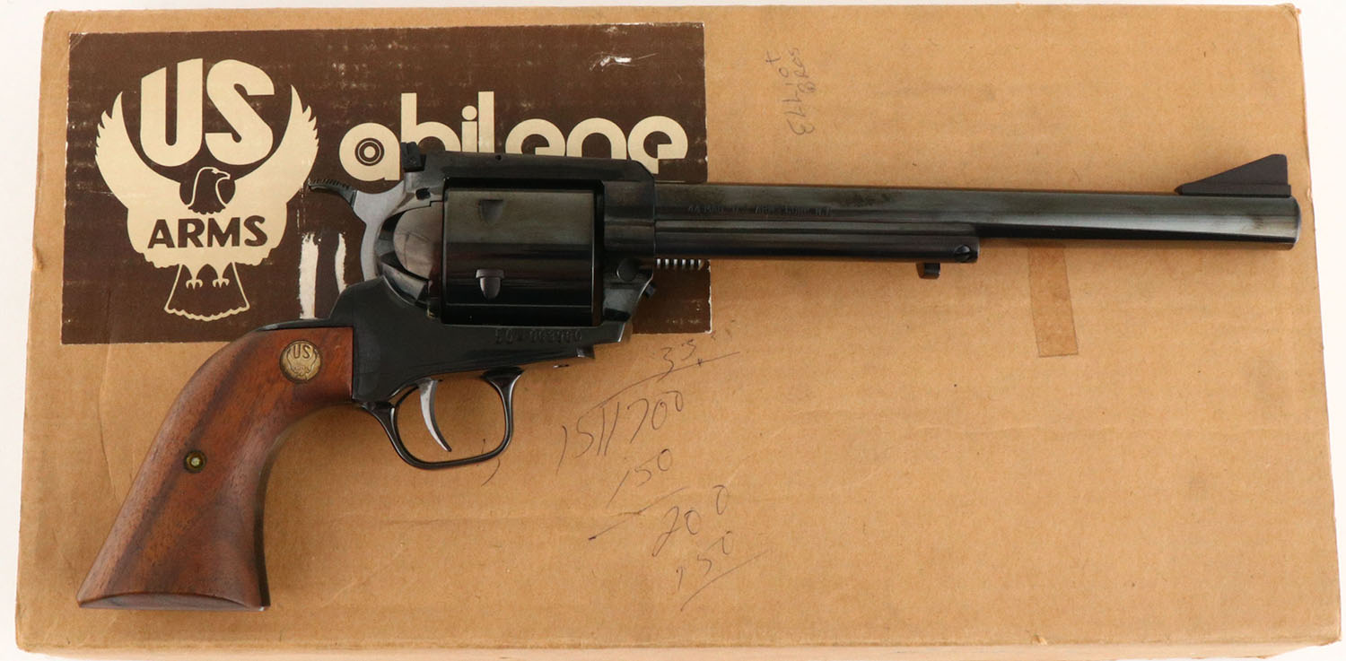 U.S Arms Co. Abilene (Model 508 AB), CAL: 44MAG, MFG: 1970's, SN: 50-003980, Single Action Revolver, 8 1/2'' barrel. The original wood grips with inlaid medallions are excellent. The medallions have a thin aged patina around the edges. The metal blue finish rates 99% overall. Bore is excellent, near mint. Adjustable rear sight & large serrated blade front sight. Comes in factory SN matching cardboard box. Box condition is very good, with some writing on the lid. FFL Req. - Value: 350 to 650