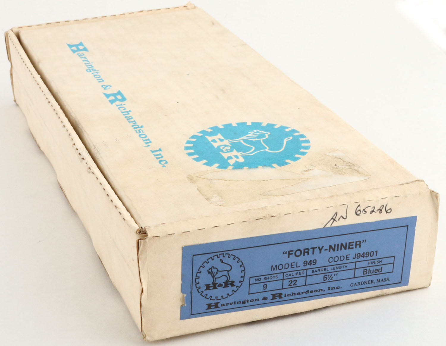 BOXED, Harrington & Richardson, Model 949 ''Forty Niner'' Second Model, CAL: 22, MFG: 1973-86, SN: AN65286, Double Action Revolver, 5 1/2'' barrel. The second model is identical to the first model, except the second model has a safety transfer bar. The wood grips are excellent. The metal blue finish rates 99% overall. Bore is excellent. Square notch rear sight & large blade front sight. Comes in factory SN matching box, with owners manual. FFL Req. - Value: 150 to 250