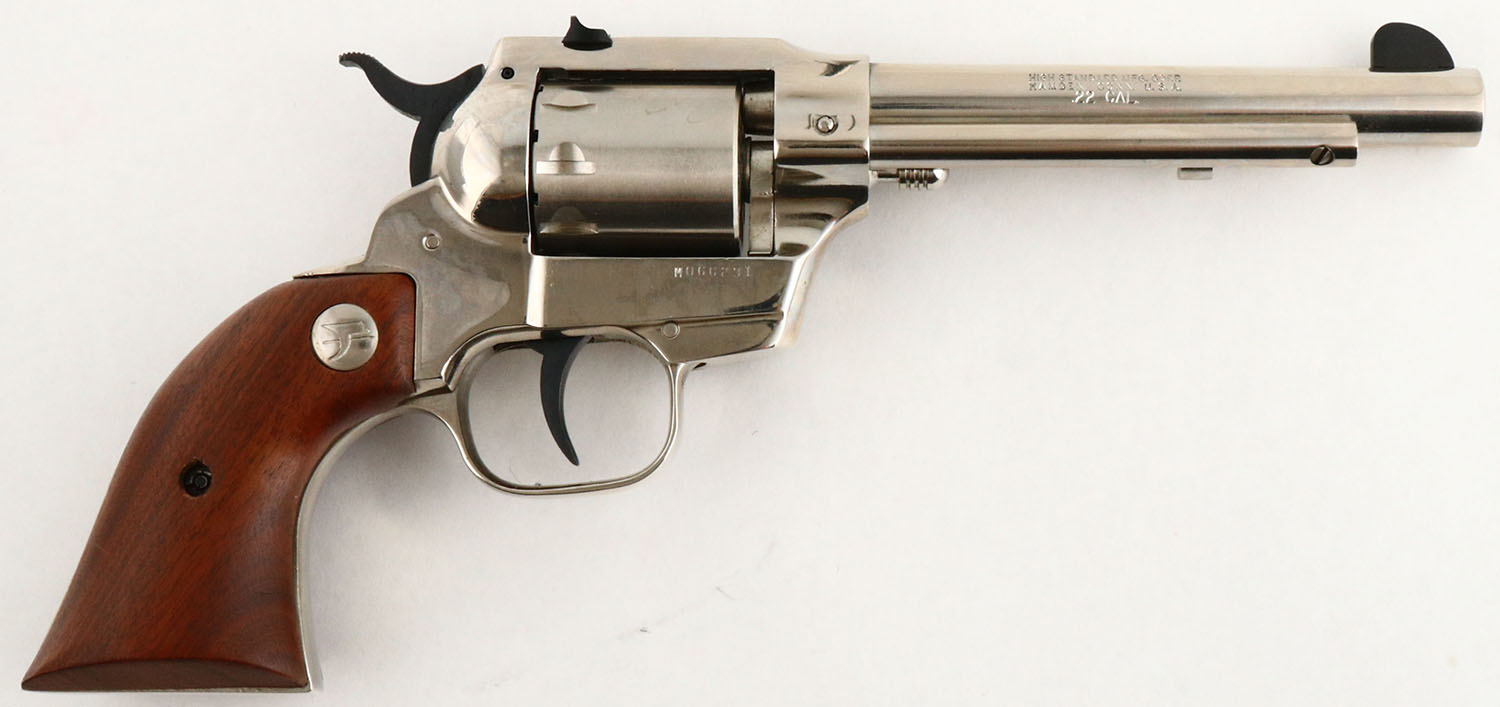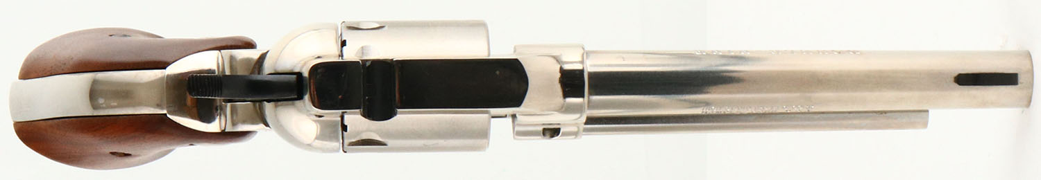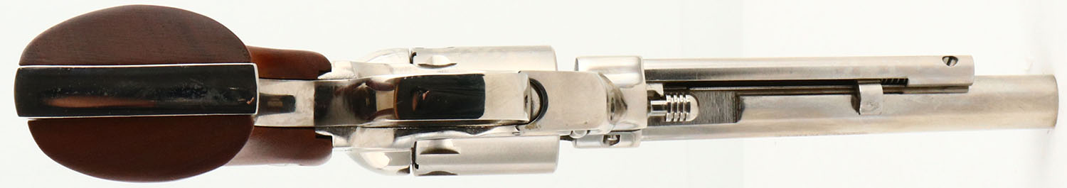 NEW BOXED, High Standard, Double-Nine Convertible, CAL: .22 LR/.22 MAG, MFG: 1960's, SN: M066231, Double Action Revolver, 5 1/2'' barrel. The HS logo medallion wood grips are mint. The original nickel finish is excellent overall. This revolver was removed from it's original packaging & has some remnants of factory grease throughout. Bore is mint. Square notch rear sight & large dorsal fin blade front sight. Comes in factory SN matching box, with extra cylinder, related paperwork & original packaging. FFL or C&R Req. - Value: 300 to 600