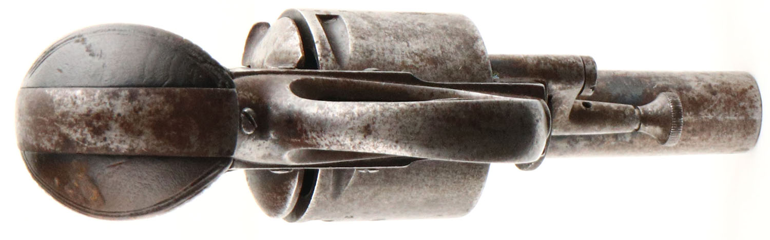 P. Webley & Son, The British Bull Dog, CAL: 44 Webley? (cal not marked), MFG: 1880's, SN: N/A, Double Action Revolver, 2 1/2'' barrel. The top of the barrel is marked ''P.WEBLEY & SON'', the right side of the barrel is marked ''LONDON & BIRMINGHAM''. The top of the frame is marked in two lines ''THE BRITISH BULL DOG''. The body of the cylinder is stamped ''444''. There are numerous British proofs throughout the revolver. The original checkered wood grips are very good & solid. There are some scrapes & dings, with checkering beginning to smooth towards the bottom of both grips. The original metal blue finish rates 10% overall, mostly worn to metal gray & toned to a brown patina, with consistent spotting & speckling throughout. Bore is good, with roughness & intermittent light pitting. Integral v-notch rear sight & blade front sight. Caliber Comment: we have loaded both a 44 Bull Dog & 44 Webley into the cylinder, the 44 Webley cartridge overall fits better than the 44 Bull Dog. We did not have a .442 CF to try. Measurements by request. Antique, No FFL Req. - Value: 200 to 450