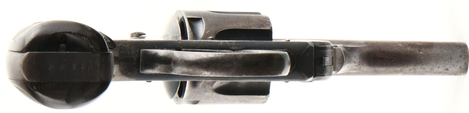 Harrington & Richardson, Top Break Automatic Ejecting Model 3 - First Variation, CAL: 38 S&W, MFG: 1905-08, SN: 164129, Double Action Revolver, 3 1/4'' barrel. The mismatched Target logo & F&W checkered hard rubber grips are fair, the left grip has a crack through the middle & an edge chip. The F&W right grip has a sizeable chip at the butt. The metal blue finish on the barrel has worn to a mix of metal gray, brown patina & remaining blue in protected areas. The frame rates 60% with concentrated loss to the straps & consistent spotting toned a brown patina. Bore is good & clean, with consistent roughness & light pitting. Notch rear sight & blade front sight. Top break latch moves freely, likely an internal parts issue. FFL or C&R Req. - Value: 100 to 150