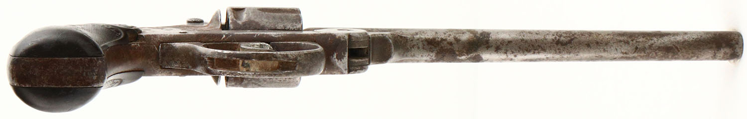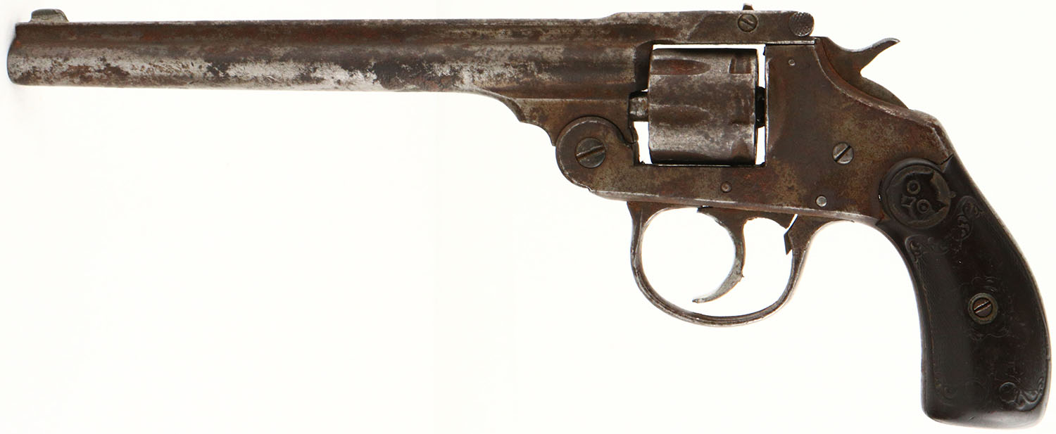 Iver Johnson, Model 1900?, CAL: 22, MFG: N/A, SN: 26802, Double Action Revolver, 6'' barrel. The IJ owl head grips are fair. There is a small edge chip on the upper front corner of the right grip, along with smooth checkering, contusions & scrapes. The metal finish has fully worn to gun metal gray & toned to a brown patina, with a fair amount of standing rust. Bore is fair, consistently rough with pitting. Notch rear sight & blade front sight. Multiple issues with mechanical operation. Needs to be inspected by a licensed gunsmith before operation. SOLD AS IS- NO RETURNS. FFL or C&R Req. - Value: 40 to 100