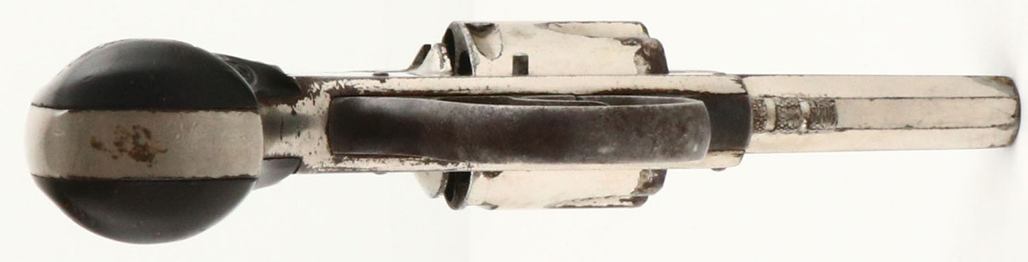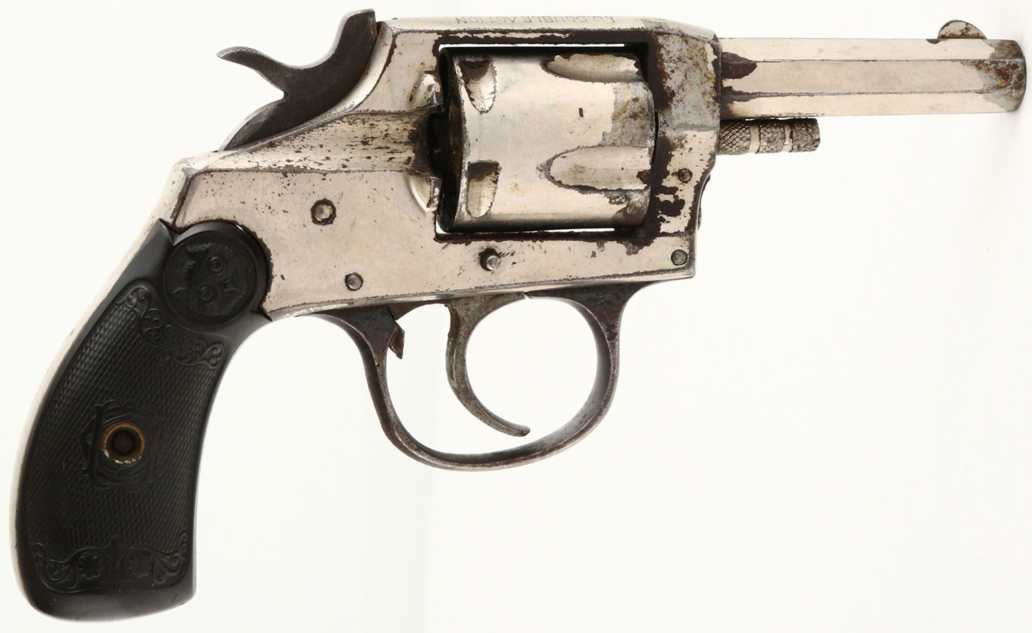 Iver Johnson, Model 1900, CAL: 32RF, MFG: 1900-41, SN: 8007, Double Action Revolver, 2 1/2'' barrel. The IJ owl head checkered hard rubber grips are excellent. There are minor handling marks. The nickel finish rates 80% overall, with intermittent flaking & concentrated in front of the cylinder. Bore is good & bright, with intermittent roughness & pitting. Integral notch rear sight & blade front sight. FFL or C&R Req. - Value: 50 to 150