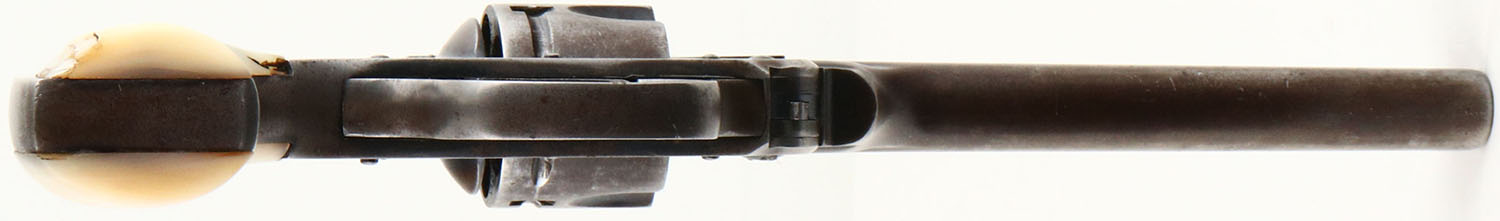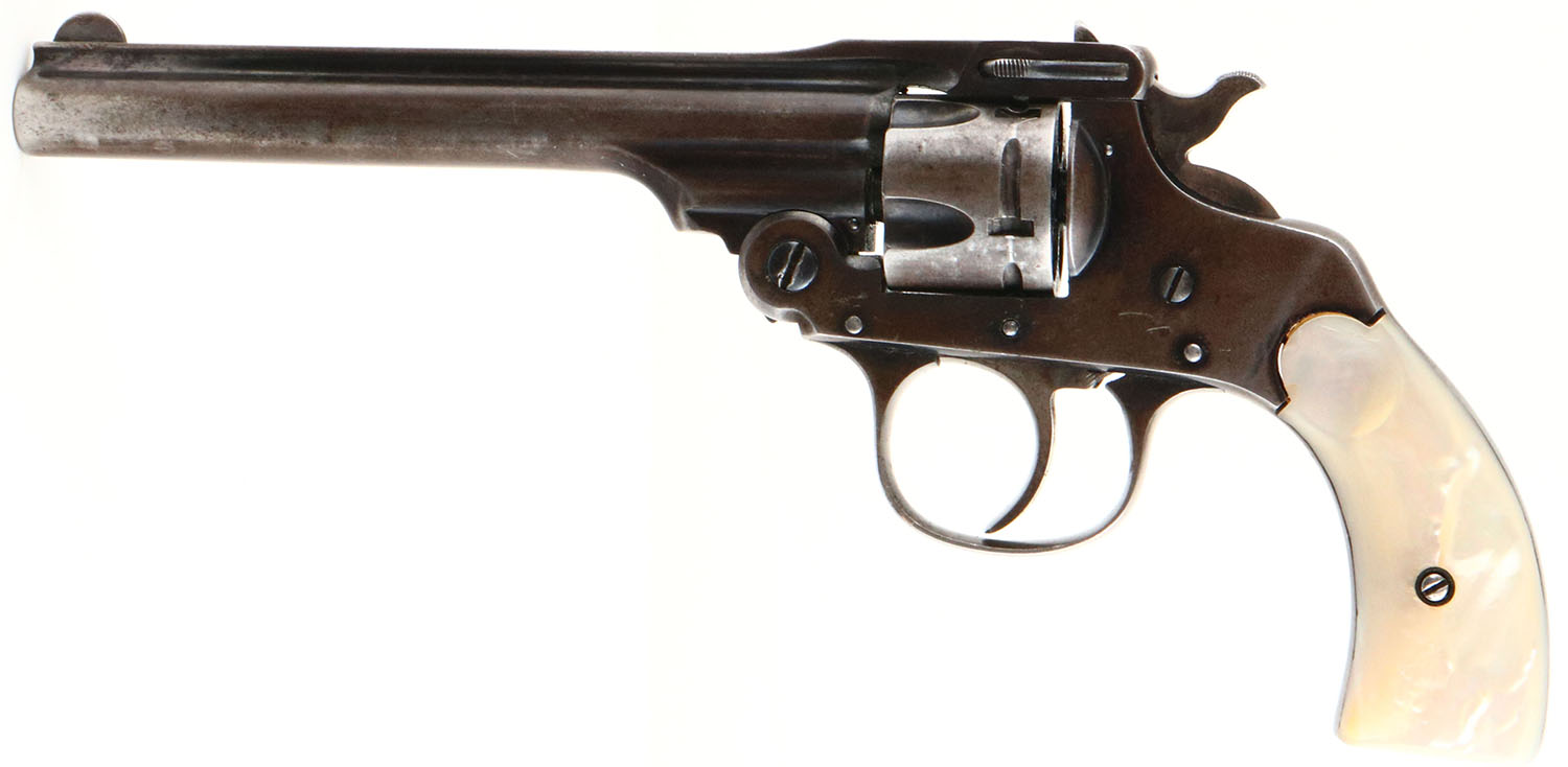 Hopkins & Allen, Safety Police, CAL: 32 S&W, MFG: 1908-15, SN: 3159, Double Action Revolver, 5'' barrel. The Mother of Pearl grips are good overall. The left grip is very good, with only a couple small edge chips & the right grip is fair, with a large chip off the back side & a crack running through most of the grip. The metal blue finish has worn to a mix of metal gray, brown patina & remnants of original blue in protected areas. Bore is very good & bright, with intermittent roughness. Small V-notch rear sight & blade front sight. FFL or C&R Req. - Value: 80 to 250