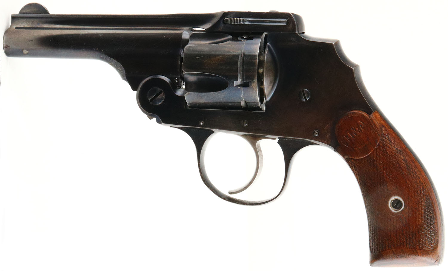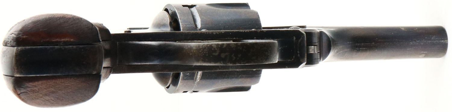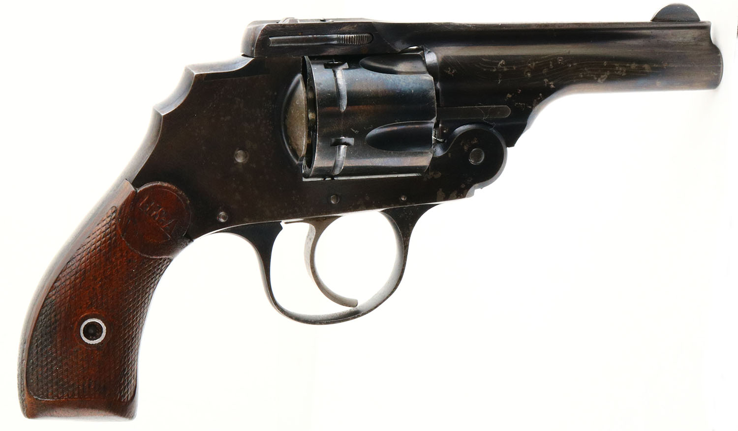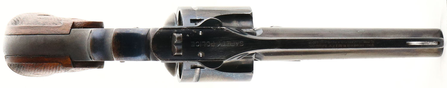 Hopkins & Allen, Safety Police Hammerless, CAL: 38 S&W, MFG: 1902-14, SN: 14768, Double Action Revolver, 3 1/4'' barrel. The H&A checkered wood grips are very good & solid. There are minor handling marks & the checkering is beginning to wear smooth. The metal blue finish rates 75% on the barrel & 40% on the frame, with areas toned to a brown patina & intermittent flaking. Bore is excellent, with a few spots of roughness. Small V-notch rear sight & blade front sight. FFL or C&R Req. - Value: 150 to 250