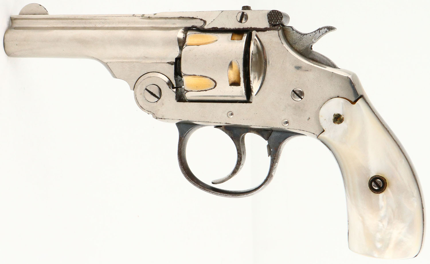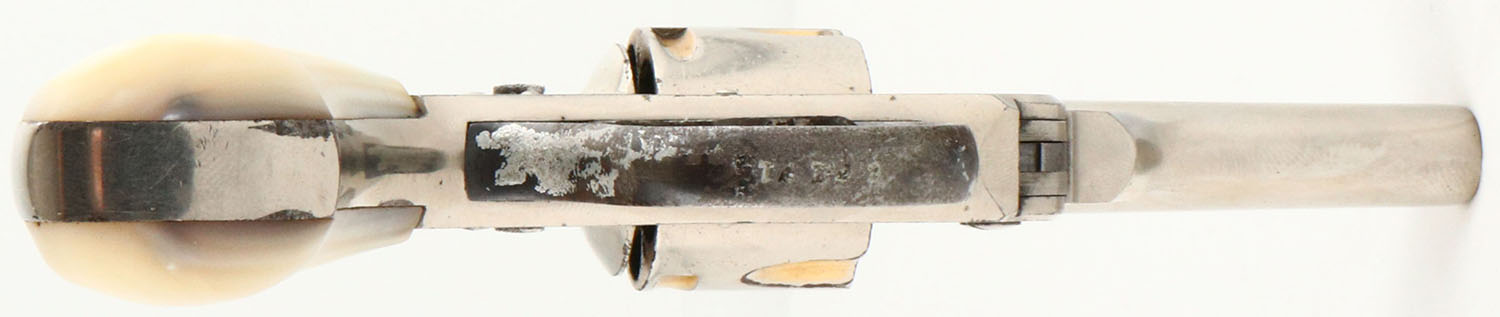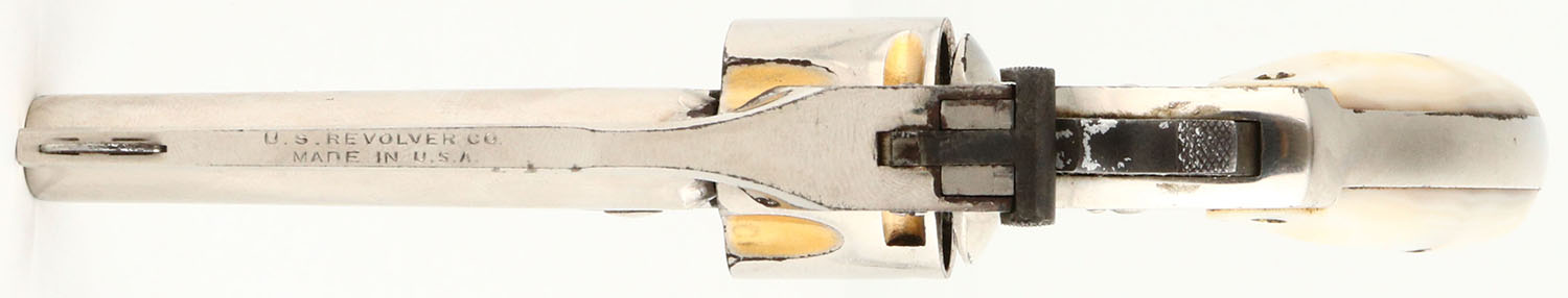 US Revolver Co., Top Break, CAL: .32 S&W, MFG: 1910-35, SN: 67171, Double Action Revolver, 3'' barrel. The Mother of Pearl grips are very good. Both grips have a small drilled indentation, from what appears to be an old inlay of a jewel or stone, otherwise excellent. The nickel finish rates appx. 90% on the barrel, with flaking toned to a brown patina near the break latch. The frame rates 95%, & the trigger guard has mostly worn to metal gray & toned to a brown patina. Bore is good, consistently rough, with intermittent pitting. Small notch rear sight & blade front sight. FFL or C&R Req. - Value: 100 to 250
