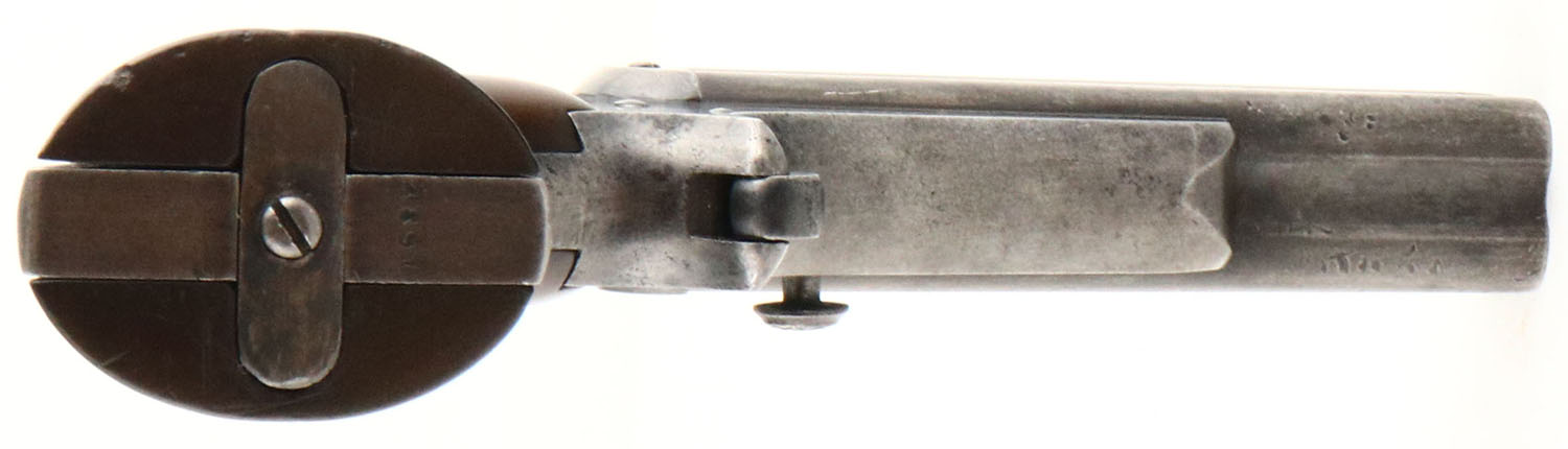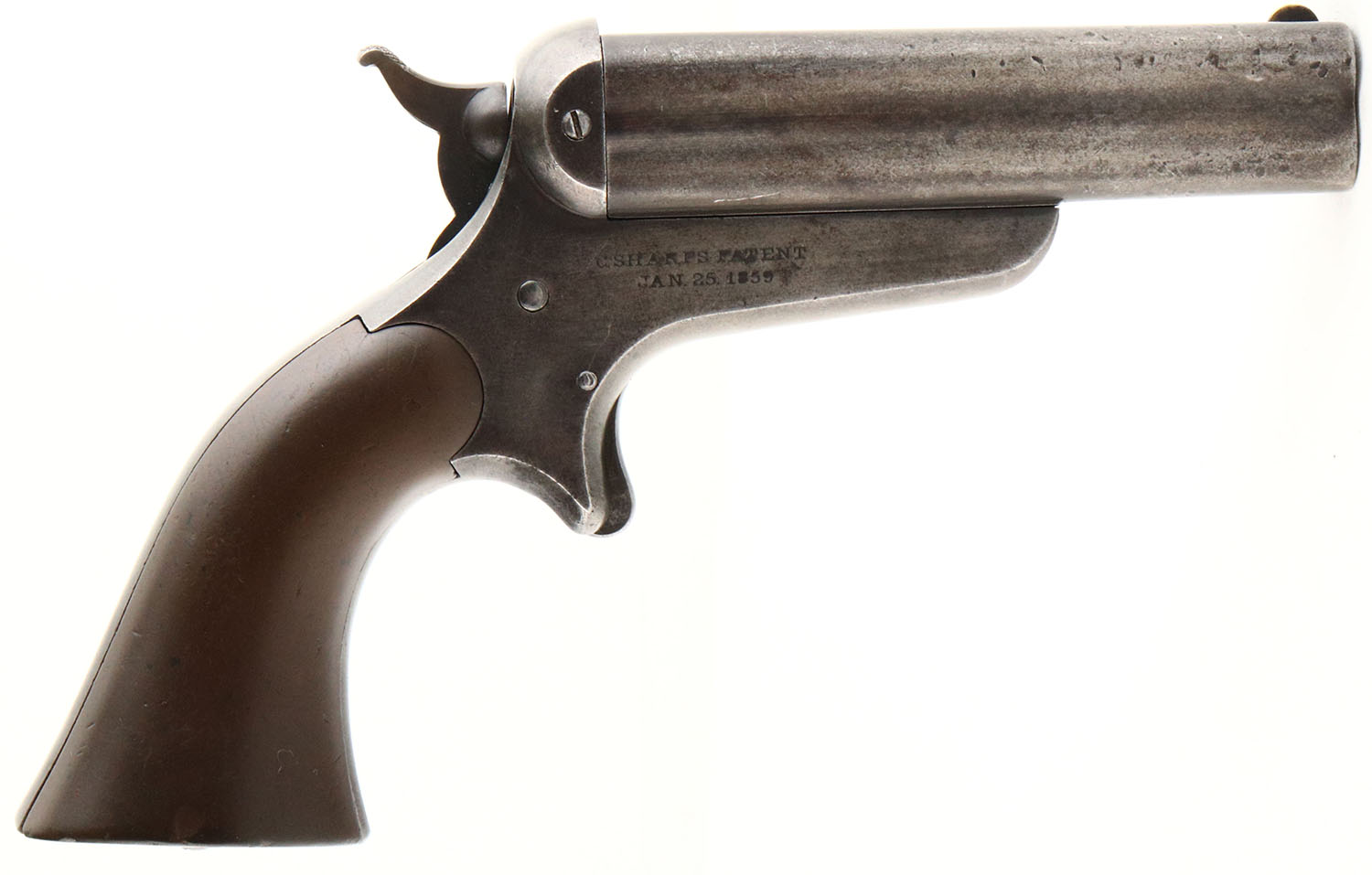 Sharps & Hankins, Model 3B 4-Barrel Pepperbox, CAL; 32, MFG: circa 1860's, SN: 4891, Single Action Derringer, 3 1/2'' barrel. The top of the barrel cluster is marked ''ADDRESS SHARPS & HANKINS PHILADELPHIA.PENN'', the right side of the frame is marked in two lines ''C.SHARPS PATENT JAN 25 1859''. The SN can be seen on the butt. The original Gutta Percha grips are very good & solid. There are some contusions, scrapes & dings. The metal blue finish on the barrel cluster has worn to metal gray, toned to a brown patina & there are remnants of remaining blue on the frame, mostly worn to metal gray & toned to a brown patina. Bores are good, still somewhat bright, with roughness & pitting. Integral notch rear sight & small blade front sight. The rotating firing pin does not rotate when the hammer is cocked. Other mechanical operations appear to function properly. SOLD AS IS NO RETURNS. Antique, No FFL Req. - Value: 800 to 1600