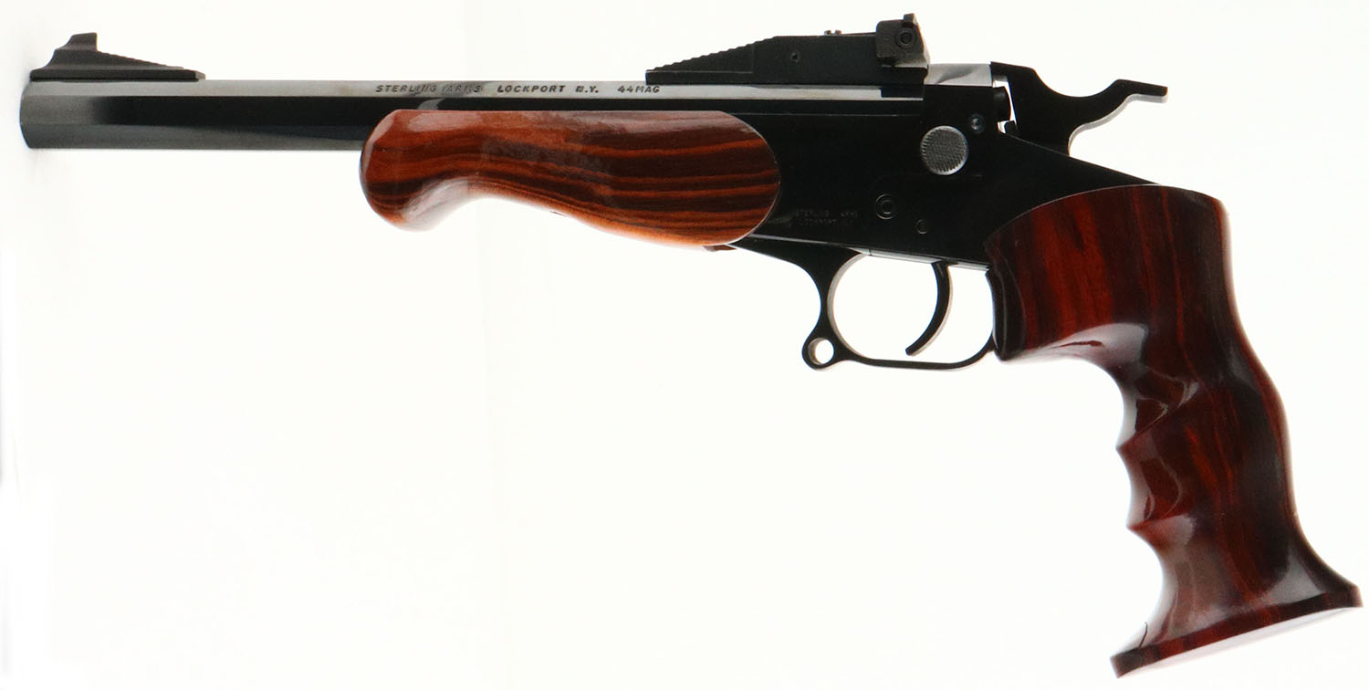 Sterling Arms, X-Caliber, CAL: 44 MAG, MFG: Late 70's early 80's, SN: 0001620, Single Shot Pistol, 10'' octagon barrel. The original wood grip is good & the forend is excellent. The grip has a repaired toe chip & a 2'' grain crack from the top of the grip to the middle. The metal blue finish rates 98% overall. Bore is excellent. Factory sights. FFL Req. - Value: 300 to 500