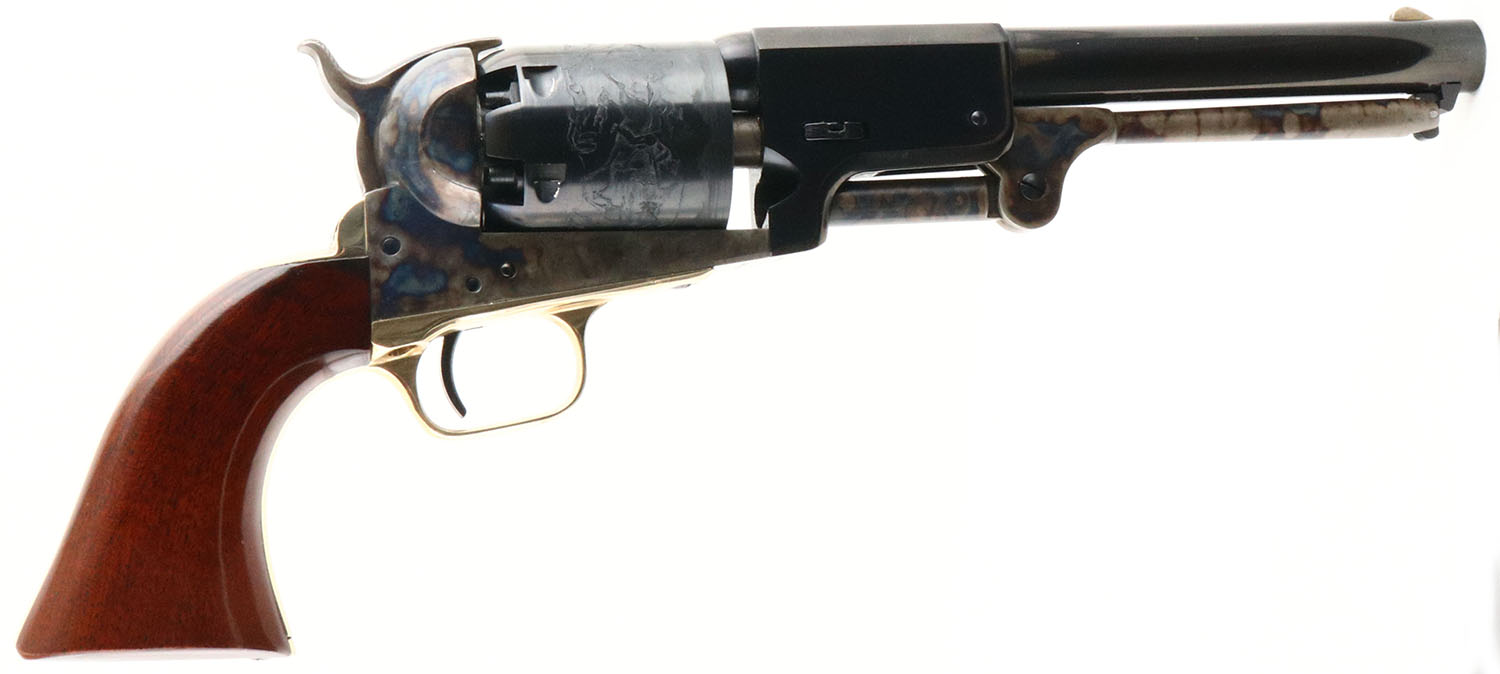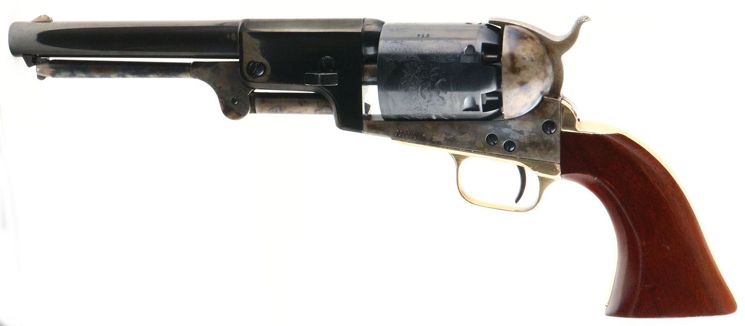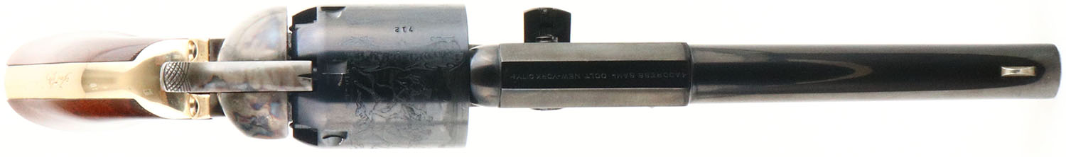 Colt Black powder Arms Co., USMR Model- Signature Series CAL: 44, MFG: Modern, SN: 34712, Single Action Percussion Revolver, 7 1/2'' barrel. The wood grips are excellent. There are some minor dings to the finish. The metal blue finish on the barrel & cylinder rates 99%. The case-hardened frame & ram-rod retain excellent case-colors, with some areas fading on the frame. Brass trigger guard is bright. Bore is excellent. Brass blade front sight.
