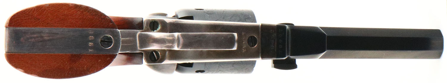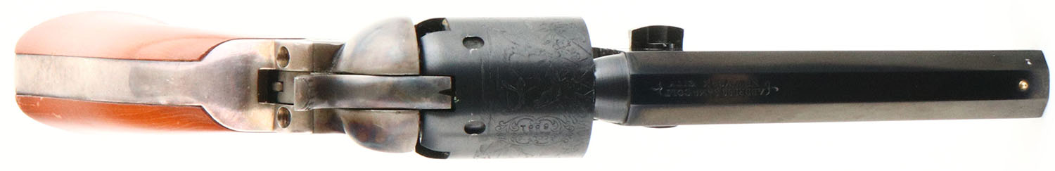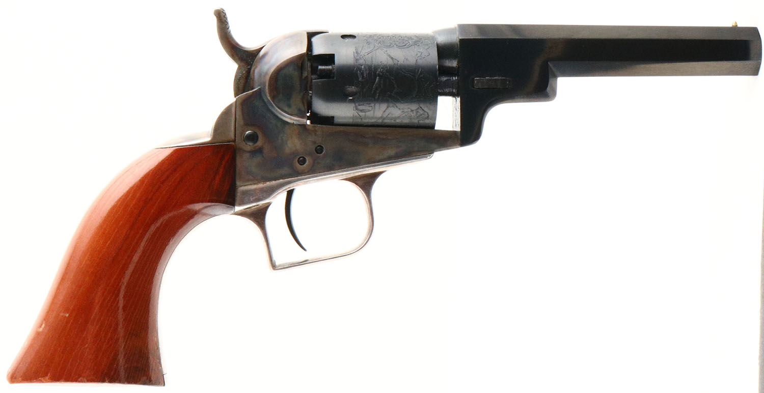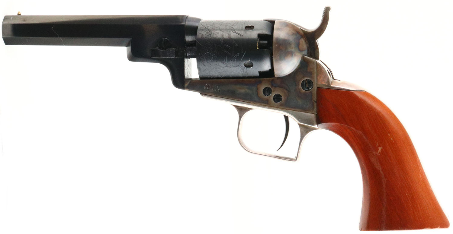 Colt, 1849 Pocket, Modern Reproduction, CAL: 31, MFG: Modern, SN: 16881, Single Action Percussion Revolver, 4'' barrel. The top of the barrel is marked ''ADDRESS SAM L COLT NEW YORK CITY''. The cylinder displays a crisp battle scene. All matching SN on the frame, barrel, trigger guard, cylinder & a partial matching SN on the butt. The wood grips are excellent, with minor dings & scrapes to the finish. The metal blue finish on the barrel & cylinder rates 99%. The case-hardened frame retains excellent case-colors. Silver tone trigger guard. Bore is excellent. Small brass cone front sight. Black powder, No FFL Req. - Value: 200 to 400