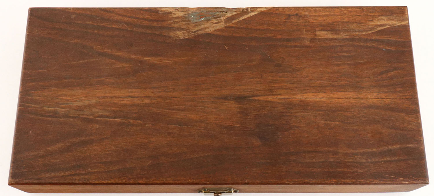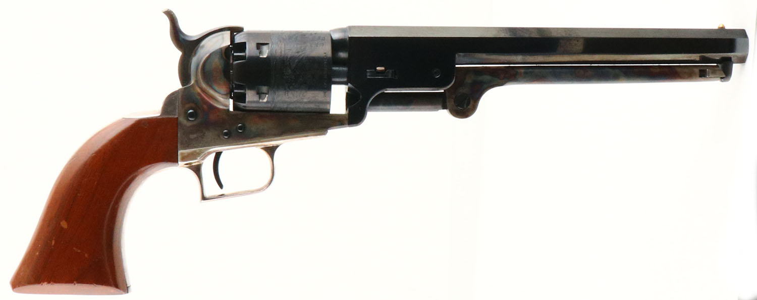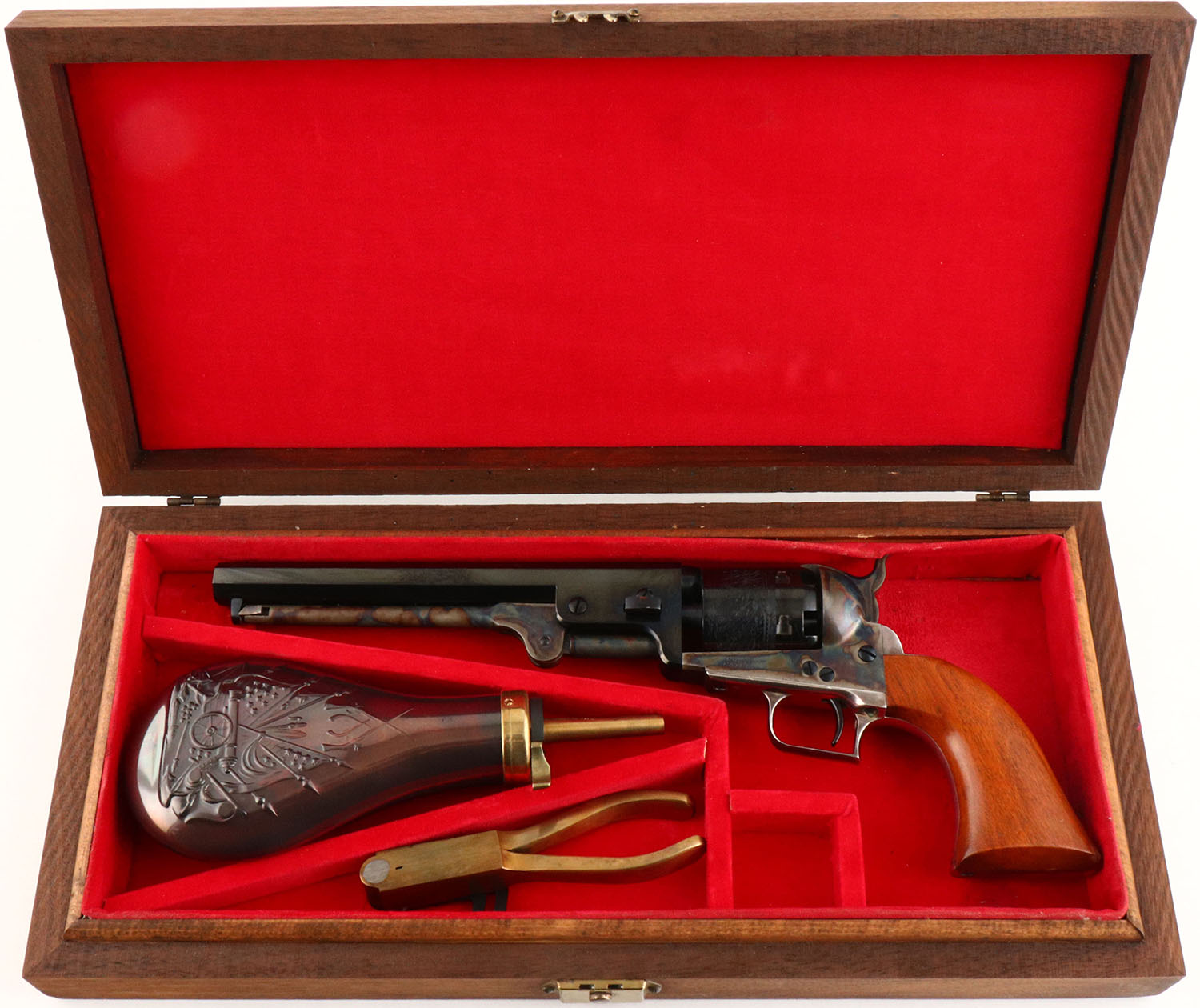 Colt, 1851 Navy - 2nd Gen, CAL: 36, MFG: 1976, SN: 21433, Percussion Single Action Revolver, 7 1/2'' barrel. The top of the barrel is marked ''ADDRESS SAM L COLT NEW-YORK CITY''. The cylinder displays a crisp Naval ship scene, with the engravers name visible. The left side of the frame is marked ''COLT'S PATENT''. All matching SN can be found on the frame, barrel, trigger guard & butt. The wood grips are excellent, with a small edge chip & a few dings to the finish. The metal blue finish on the barrel & cylinder rates 99%. The case-hardened frame & ram-rod retain excellent case-colors. The silver tone trigger guard is excellent, with the right side under the frame fading to a brass tone. Bore is excellent. Small brass cone front sight. Comes in a custom wood case, with powder flask & dual cavity bullet mould. The top back edge of the lid has some damage, otherwise excellent. Black powder, No FFL Req. - Value: 500 to 1000