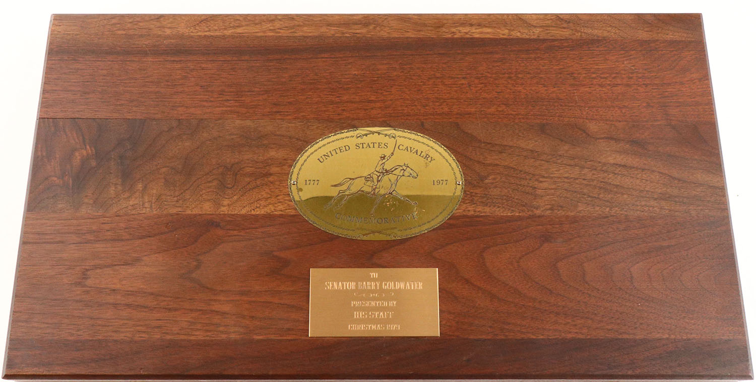 2) Colt, 1860 Army, CAL: 44, MFG: 1977, SN: 1117US, Single Action Percussion Revolver, 8'' barrel. The left side of the barrel is marked ''UNITED STATES CAVALRY COMMEMORATIVE''. The top of the barrel is marked ''ADDRESS SAM L COLT HARTFORD CT''. The left side of the frame is marked in three lines ''COLTS PATENT U.S''. The left side of the trigger guard is marked ''44 CAL''. The cylinder displays a crisp Naval engagement scene. Both grips have crisp ''MJH'' cartouches. All matching SN can be found on the frame, barrel, trigger guard & butt. The wood grips are excellent. The metal blue finish on the barrel & cylinder rates 99%. The case-hardened frame, hammer & ram-rod all retain excellent case-colors. Brass trigger guard is excellent, with a thin aged patina. Bore is excellent. Small brass blade front sight. Both pistols come in the factory presentation case, with attachable stock, powder flask, bullet mould, tool, cap tin & key. This set was presented to U.S Senator Barry Goldwater by his staff for Christmas in 1979. This can be seen on the brass plaque on the lid of the case. Only 2,945 sets made. Black powder, No FFL Req. - Value: 1500 to 3000