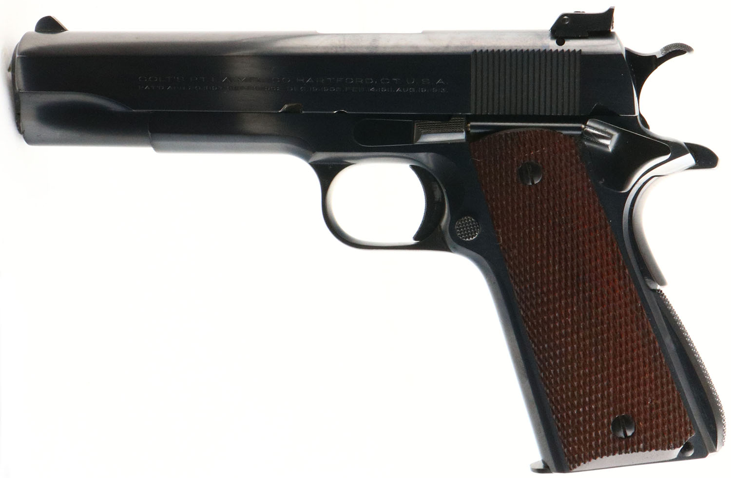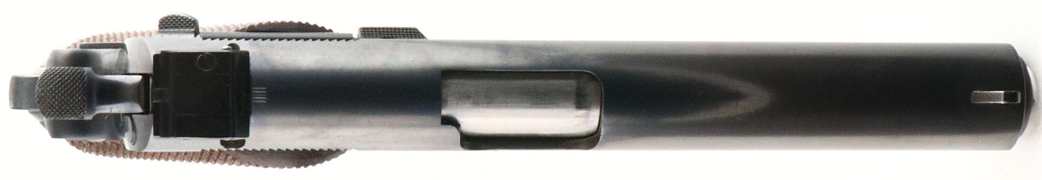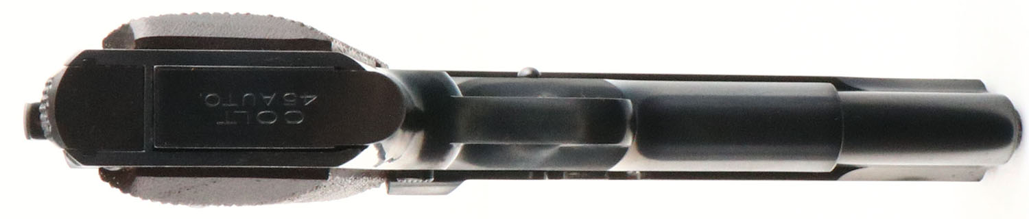 RARE & EXCEPTIONAL, Colt, 1911 National Match Pre-WWII, CAL: 45 ACP, MFG: 1938, SN: C190771, Semi Auto Pistol, 5'' barrel. The two-line address & patent dates are marked on the left side of the slide & ''NATIONAL MATCH COLT AUTOMATIC/CALIBRE .45'' followed by the Rampant Colt on the right. The right side of the frame is marked ''GOVERNMENT MODEL'' over the serial number, with ''60'' on the right side of the trigger guard & ''T/VP'' on the left. The checkered Walnut grips are near mint, with only a few minor handling marks. The original metal blue finish rates 98% overall. Bore is near mint. Factory added adjustable rear sight & blade front sight. Factory added ''New Safety Device''. This pistol comes complete with a Colt Factory Letter, confirming the configuration, date & details of the pistol. This is an extremely desirable pistol amongst Colt collectors & hard to improve the condition of this Pre-WWII National Match pistol. FFL or C&R Req. - Value: 7000 to 11000