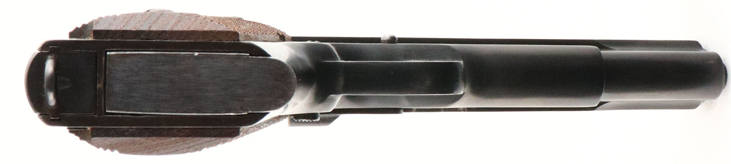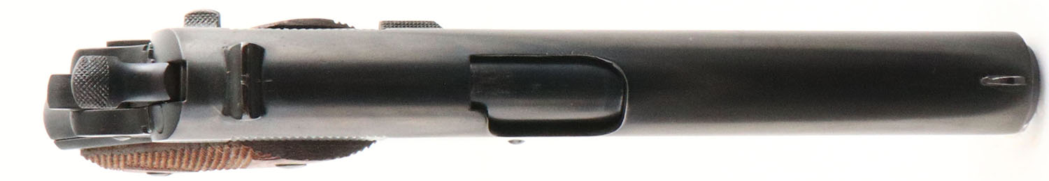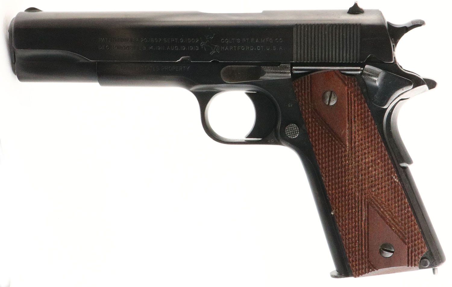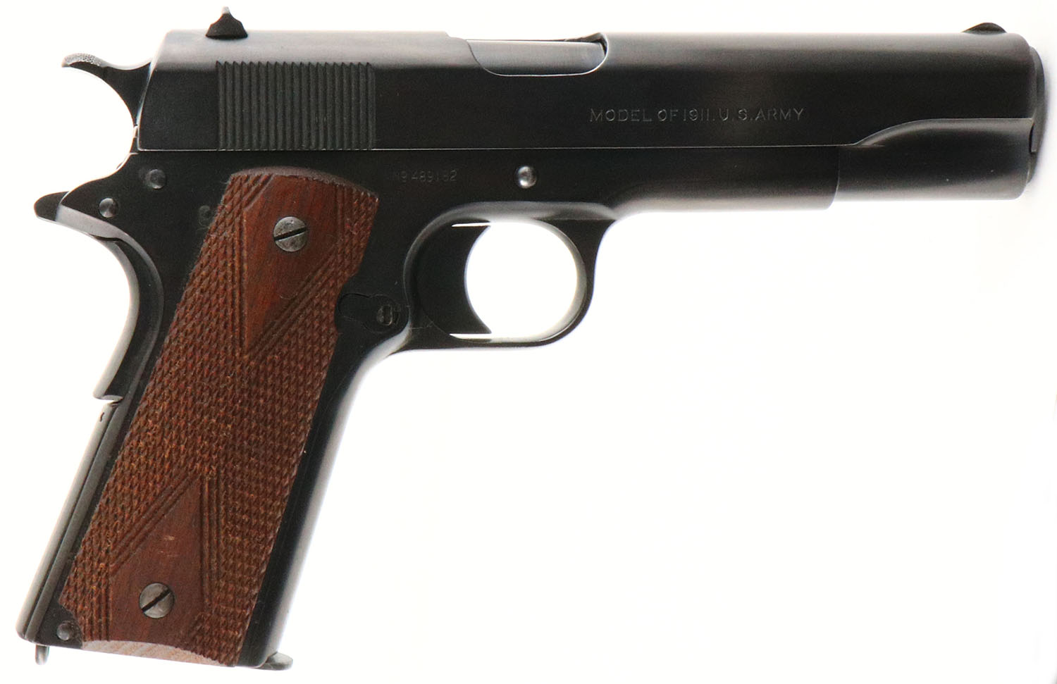 Colt, Model: M1911, Cal: .45 ACP, MFG: 1918, S/N: 489182, semi-auto pistol, 5'' barrel. The checkered double diamond wood grips are excellent with minor wear to the left grip. The metal finish was redone in a black phosphate finish by a military arsenal. The metal finish rates 96% with little wear, the finish has spots of roughness/cleaned pitting under it from the re-finish job. The left side of the slide is marked with patent dates, the rampant colt logo, ''COLT'S PT,F.A.MFG.CO.'', ''HARTFORD.CT.U.S.A.''. The right side of the slide is marked ''MODEL OF 1911.U.S.ARMY''. The left side of the frame is marked ''UNITED STATES PROPERTY'', eagles head over ''S17'' over the mag release. The right side of the frame is marked with the S/N. the left side of the trigger guard is marked ''40''. The top of the barrel is marked with a combined ''HP'' stamp. The bore is good. Its bright but has consistent roughness from the start of the rifling to the middle of the barrel, & there is noticeable wear to the rifling at the muzzle. The slide holds a blade front sight with a U-notch rear sight. Pistol comes with one period correct 2 tone mag. The slide seems to bind up & is stiff when cycling, but still operates fine. Even though this pistol was re-finished all the markings are clear & some are even crisp, making this a excellent example of a military refinished M1911. FFL or C&R Req - Value: 800 to 1400