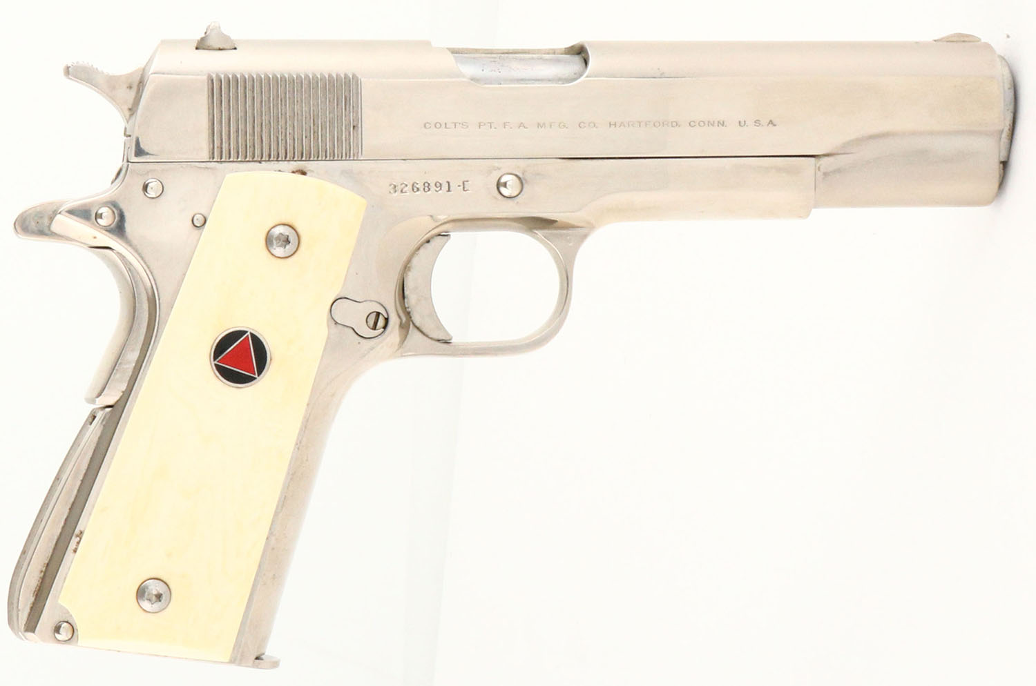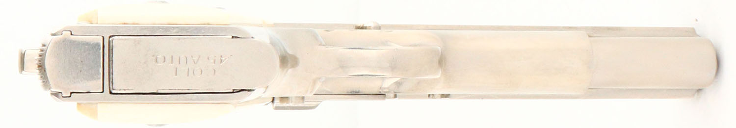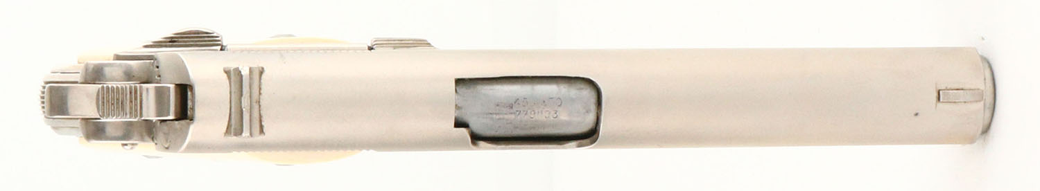 Colt, Government Model 1911- Pre-70 Series, CAL: 45, MFG: 1969, SN: 326891-C, Semi Auto Pistol, 5'' barrel. The Delta Elite faux ivory grips are excellent. The original nickel finish is excellent, with areas of haze, mostly on the right side & a couple areas with light spotting. Bore is excellent. Square notch rear sight & small blade front sight. FFL or C&R Req. - Value: 1000 to 1800