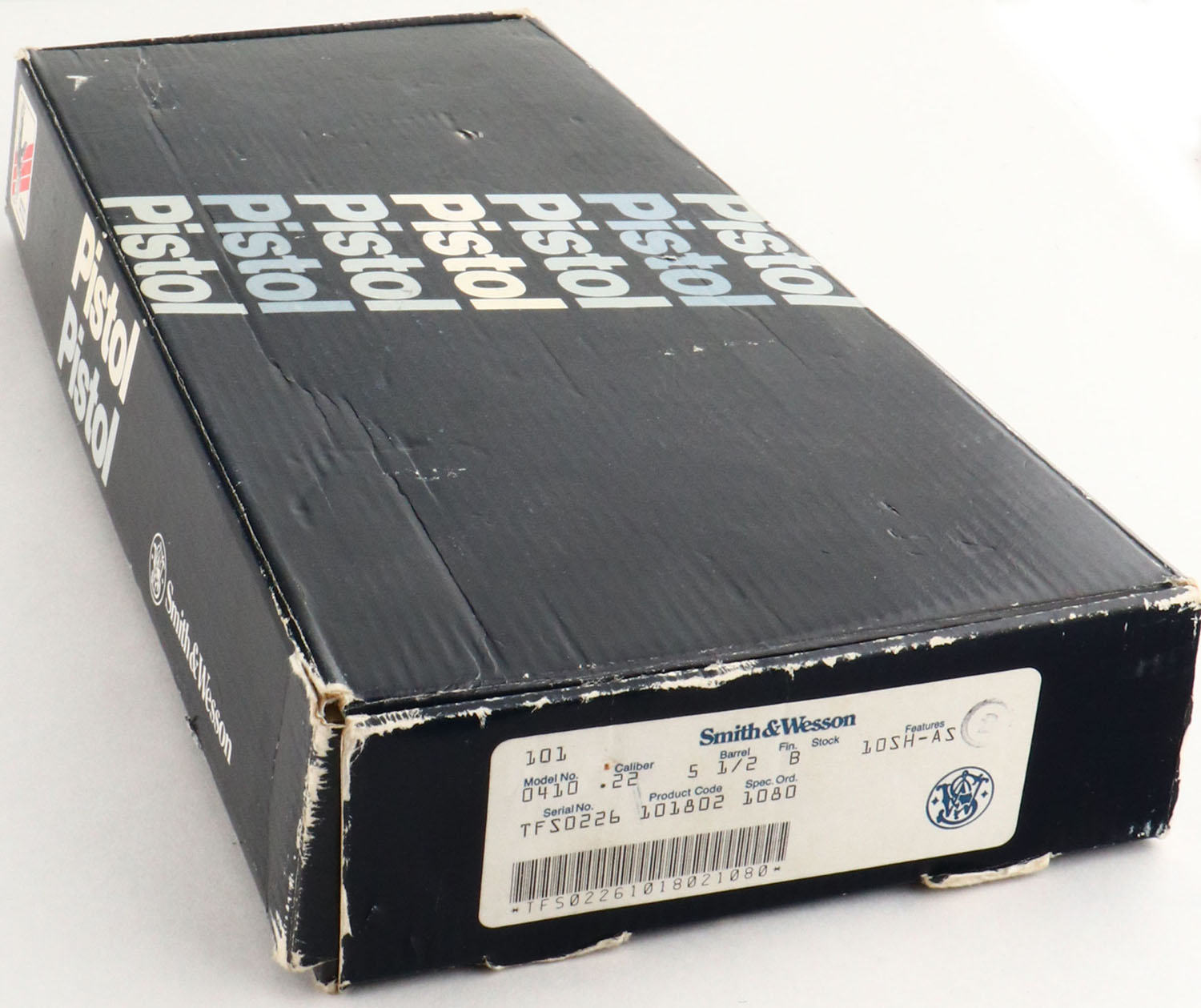 BOXED, Smith & Wesson, Model 41, CAL: 22LR, MFG: 1991, SN: TFS0226, Semi Auto Pistol, 5'' barrel. The original checkered target grips with high gloss finish, are excellent. There are minor handling & storage marks. The original metal blue finish rates 99% overall. Bore is excellent. Adjustable rear sight & ramp elevated undercut partridge front sight. Factory magazine. Comes in SN matching box, with related paperwork & original wax paper. FFL Req. - Value: 900 to 1200