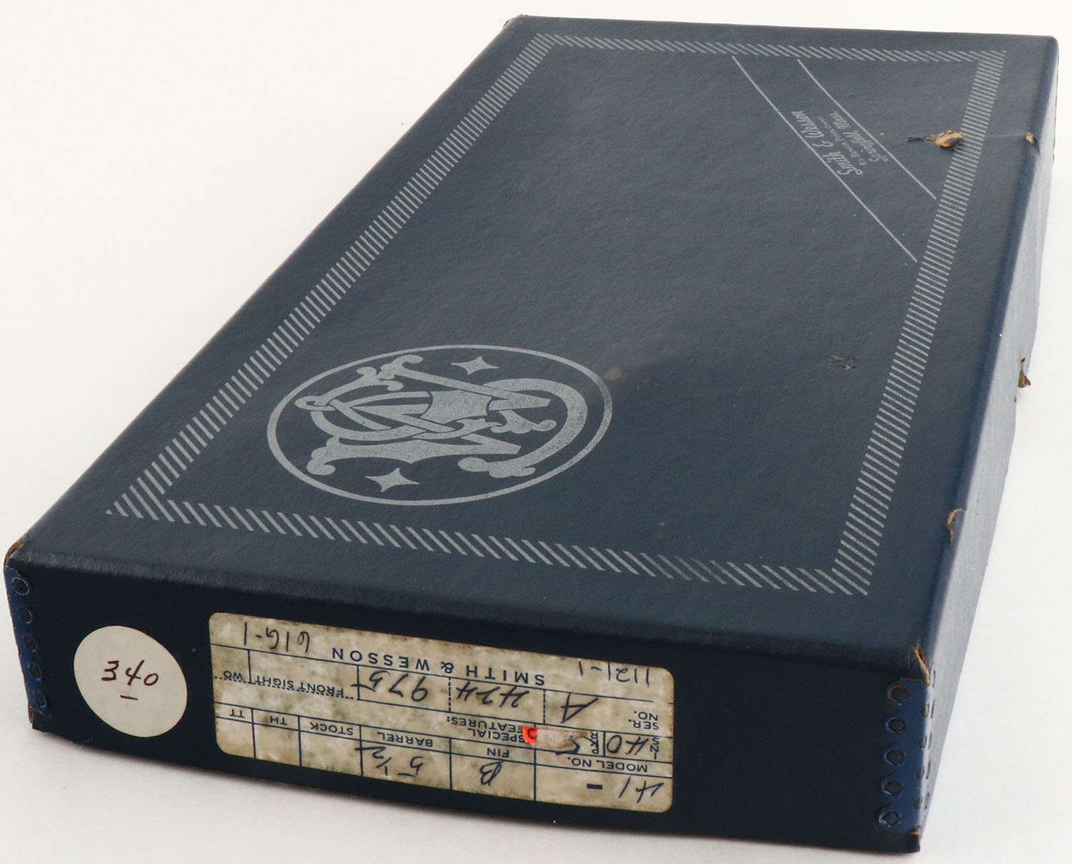 BOXED, Smith & Wesson, Model 41, CAL: 22LR, MFG: 1977-78, SN: A424975, Semi Auto Pistol, 5 1/2'' barrel. The original checkered target style grips are excellent. The orignal metal blue finish rates 99% overall. Bore is excellent. Adjustable rear sight & blade front sight. No magazine. Comes in factory SN matching box, with related paperwork, cleaning rod/tips, & original packaging. FFL Req. - Value: 500 to 900