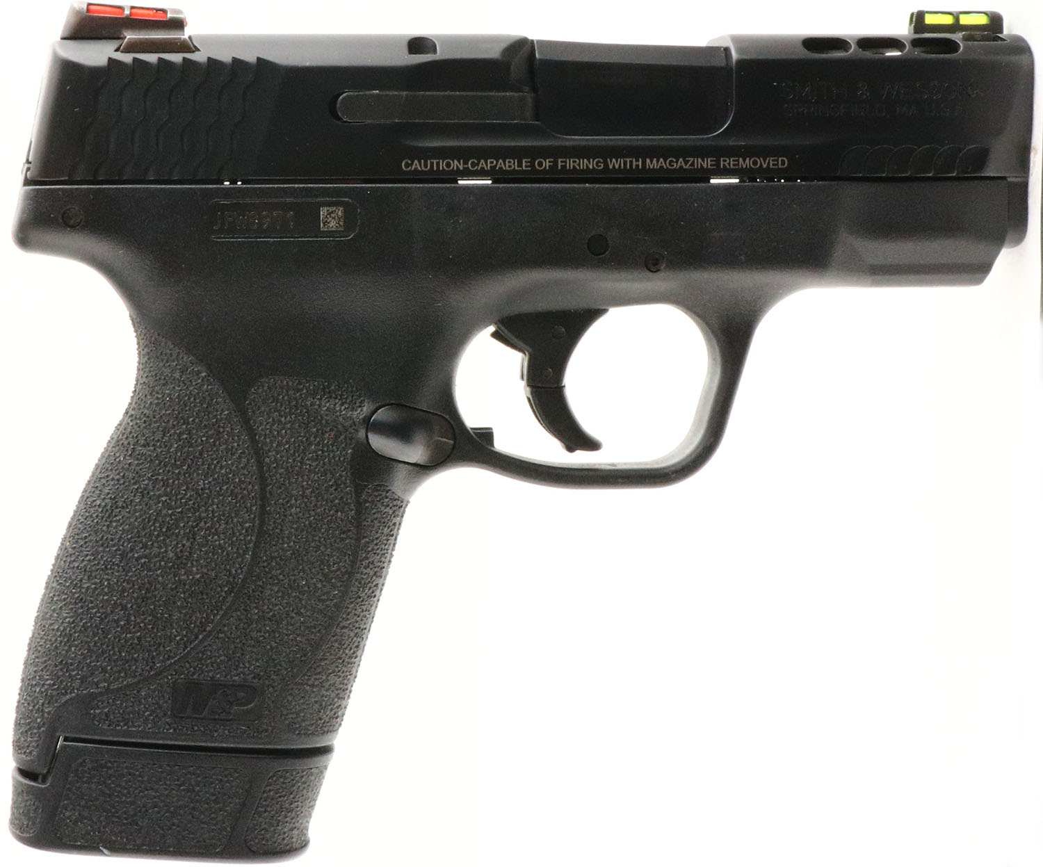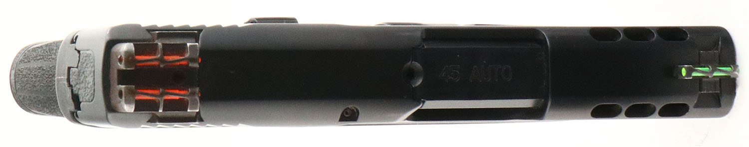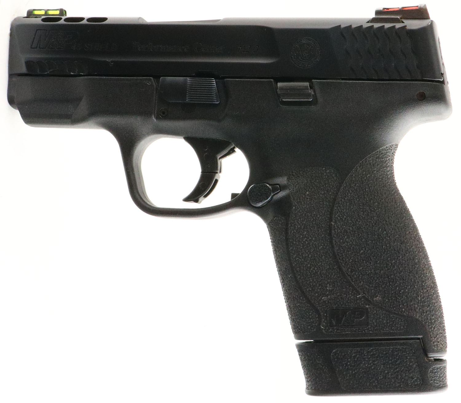 Smith & Wesson, M&P 45 Shield M2.0 Performance Center, CAL: 45 ACP, MFG: Modern, SN: JFW8971, Semi Auto Pistol, 3 1/4'' barrel. The S&W textured polymer grip frame is excellent, with light wear to the sides of the frame. The matte black finish on the ported slide rates 98%. Bore is excellent. Two-dot red fiber optic rear sight & green fiber optic front sight. The rear sight has some rust. Factory mag. FFL Req - Value: 350 to 550