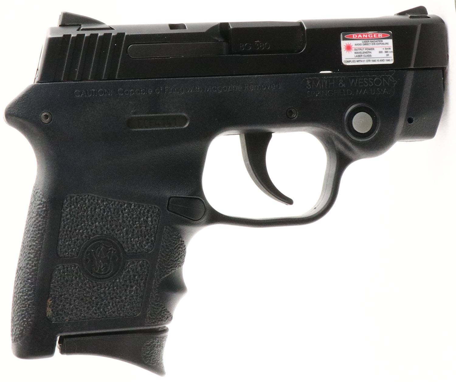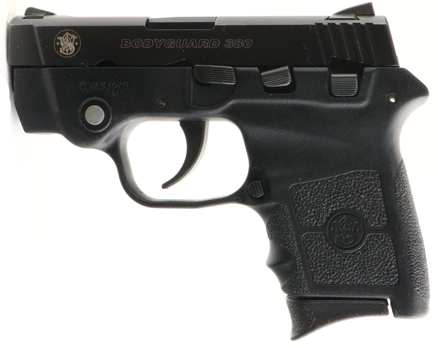 BOXED, Smith & Wesson, Bodyguard 380, CAL: 380 ACP, MFG: Modern, SN: ECF4141, Semi Auto Pistol, 2 3/4'' barrel. The S&W textured polymer grip frame is excellent. The matte black finish on the slide rates 99%. Factory laser sticker still present. Bore is excellent. Factory serrated rear & front sights. Integral Insight Laser. Comes in factory box, with related paperwork, (2) extra mags, test fire cartridge & lock. A good option for a conceal carry pistol. FFL Req. - Value: 250 to 400