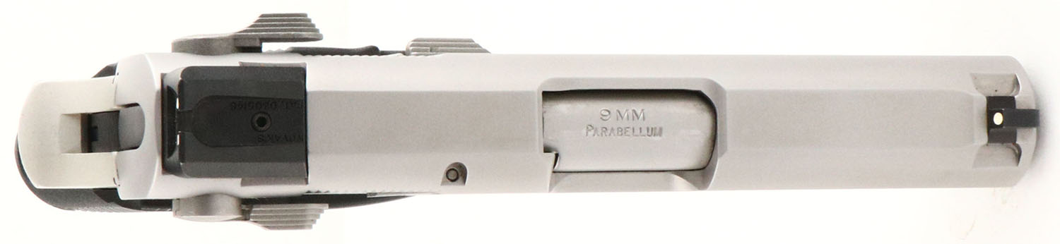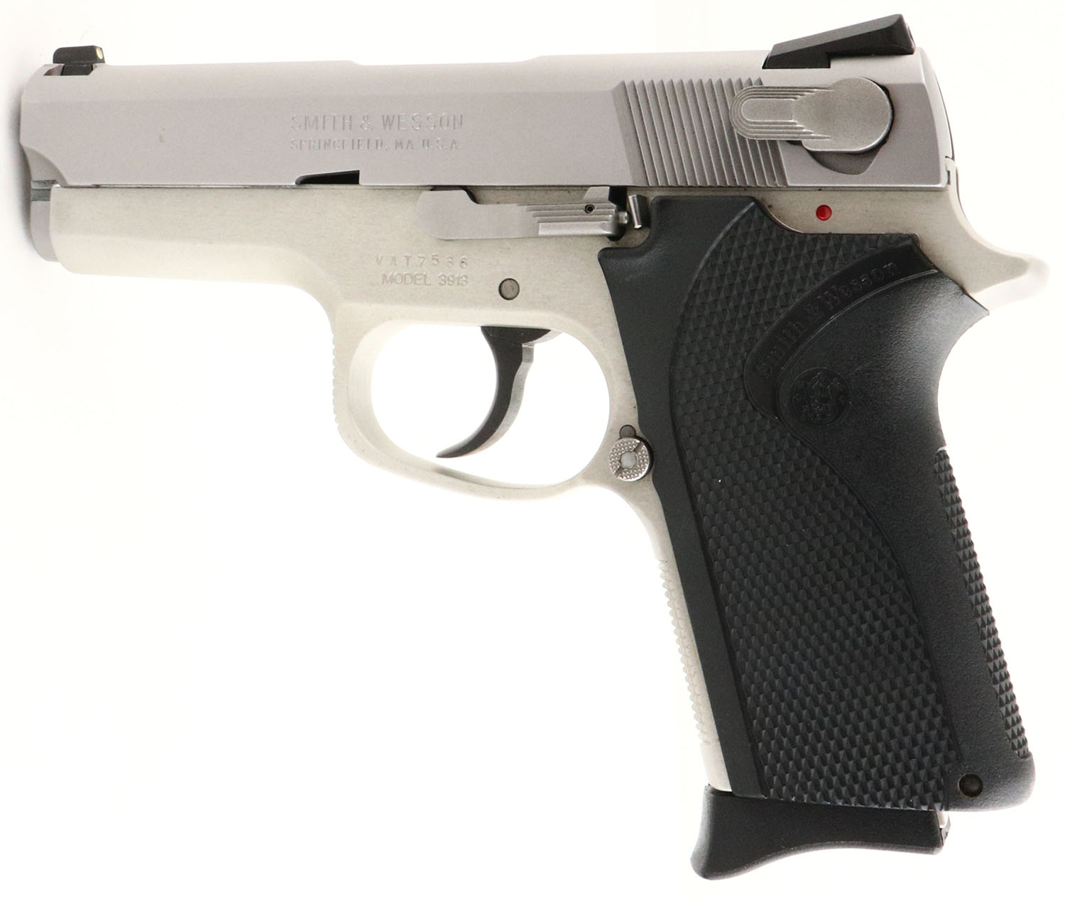 Smith & Wesson, Model 3913, CAL: 9mm, MFG: Modern, SN: VAT7536, Semi Auto Pistol, 3 1/2'' barrel. The S&W synthetic checkered grips are excellent. The stainless steel finish on the aluminum alloy frame & slide is excellent. Bore is excellent. Factory contrast sights. Factory mag. FFL Req. - Value: 450 to 600
