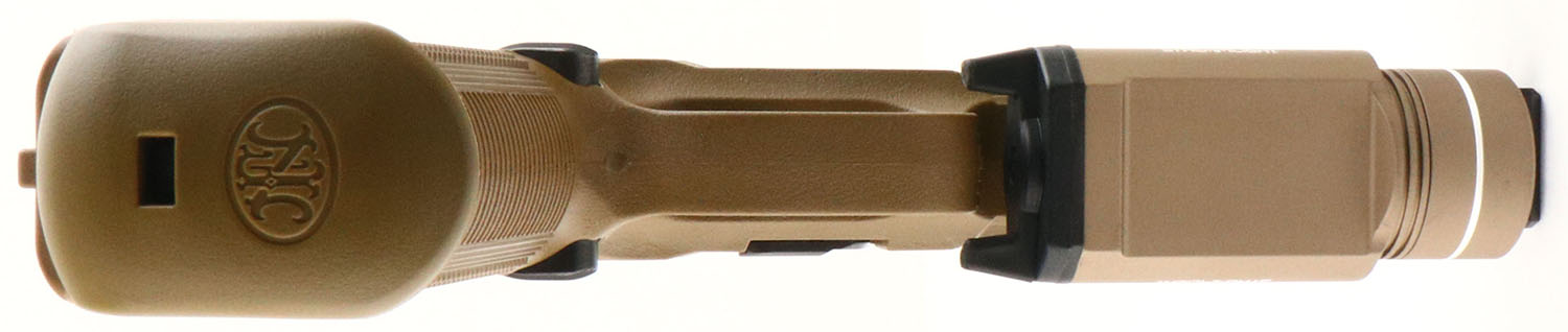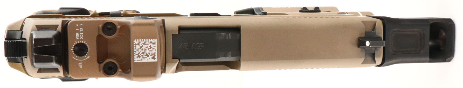CASED, FN-USA, FNX-45 Tactical, CAL; 45 ACP, MFG: Modern, SN: FX3U111786, Semi Auto Pistol, 5 3/8'' barrel. The FDE aggressively checkered polymer grip frame is excellent. The FDE Cerakote finish on the slide is excellent, with minor handling marks. Bore is excellent. Factory night sights. Trijicon RMR Type 2 red dot sight (MSRP $795). Streamlight TLR-1 HL Tactical Flashlight (MSRP $275). Apex MRAT Compensator Kit (MSRP $175). Comes in a FN fitted, soft Cordura nylon case, with related paperwork, lock, cleaning cloth, extra grip panels, tools/oil & (5) extra mags. A complete tactical setup with high dollar accessories. FFL Req. - Value: 1500 to 2300
