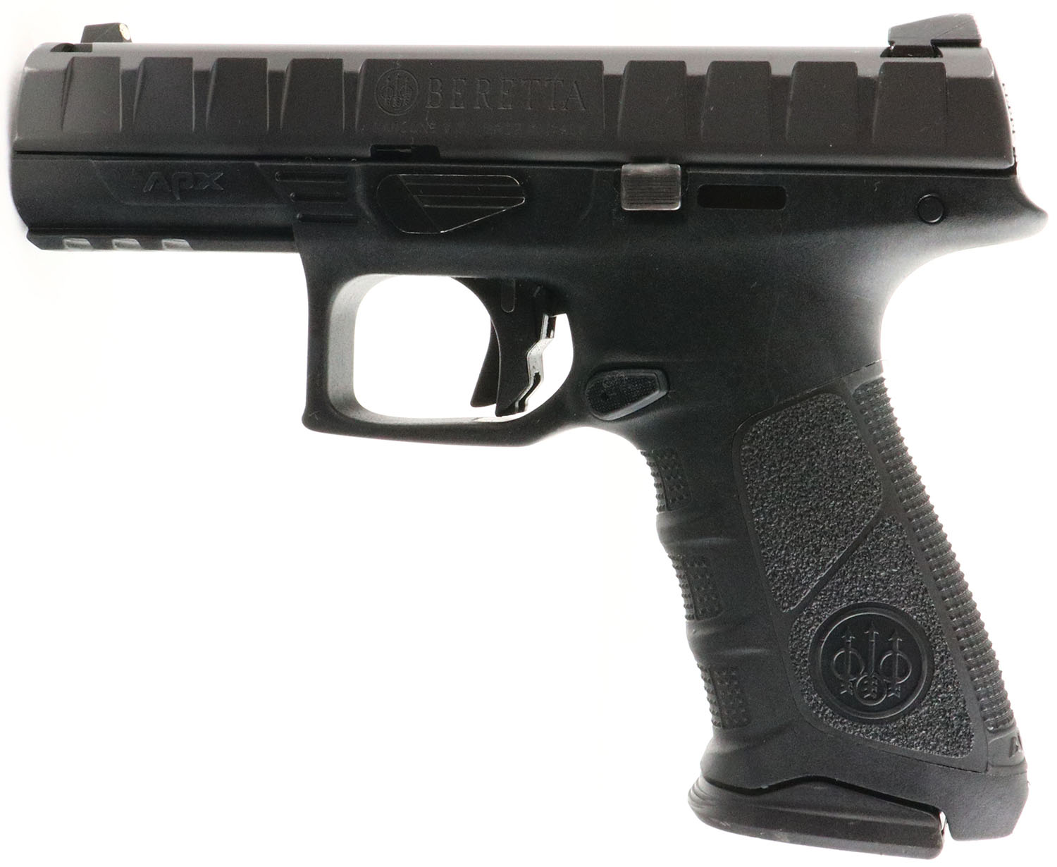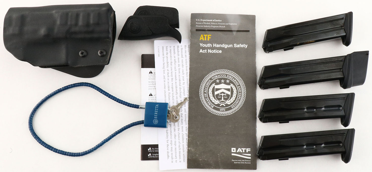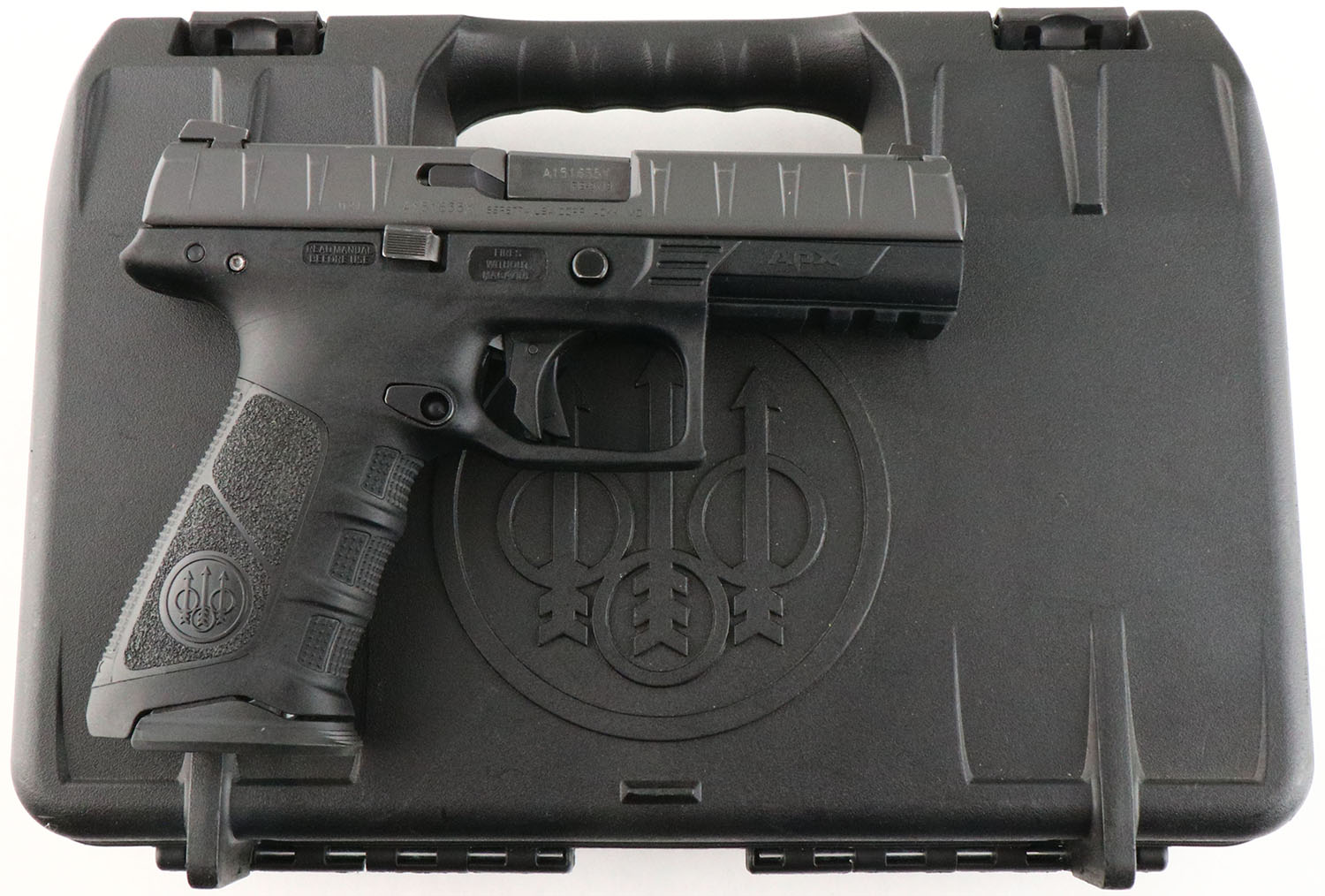 CASED, Beretta, APX, CAL: 9mm, MFG: Modern, SN: A151635X, Semi Auto Pistol, 4'' barrel. The synthetic & checkered polymer grip frame is excellent. The matte finish on the slide is excellent. Bore is excellent. Factory contrast sights. Comes in factory hard case, with related paperwork, extra grip panels, hard plastic holster, (5) extra mags, lock & cleaning brush. FFL Req. - Value: 300 to 500